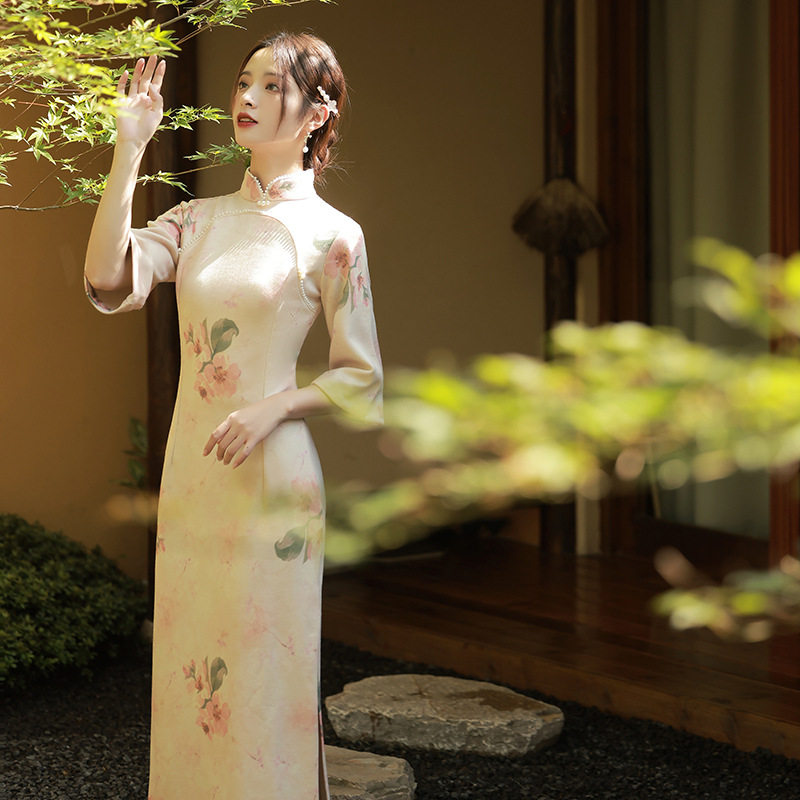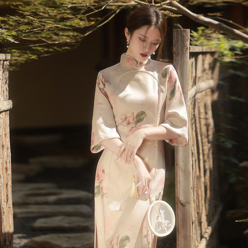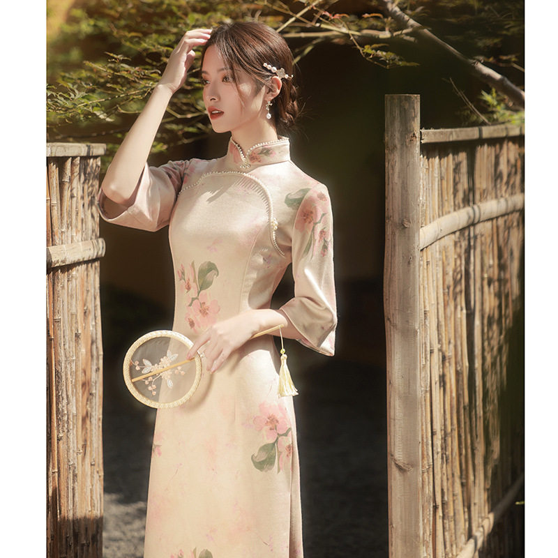 粉色大倒袖披肩旗袍女2025年新款改良春款复古气质鹿皮绒年轻长款
