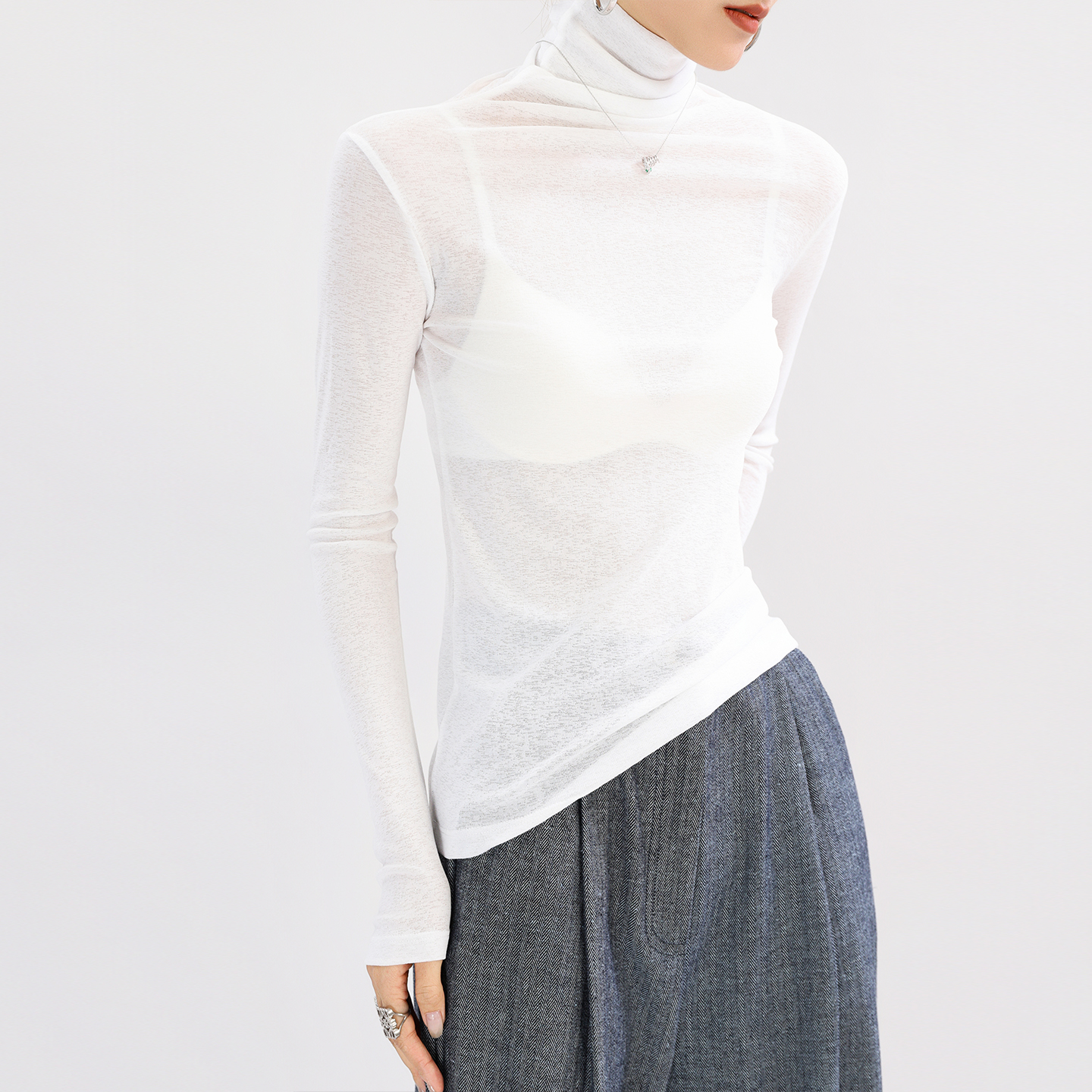 高领黑色打底衫女高级感轻奢秋冬薄款修身蕾丝网纱内搭透明打底衫