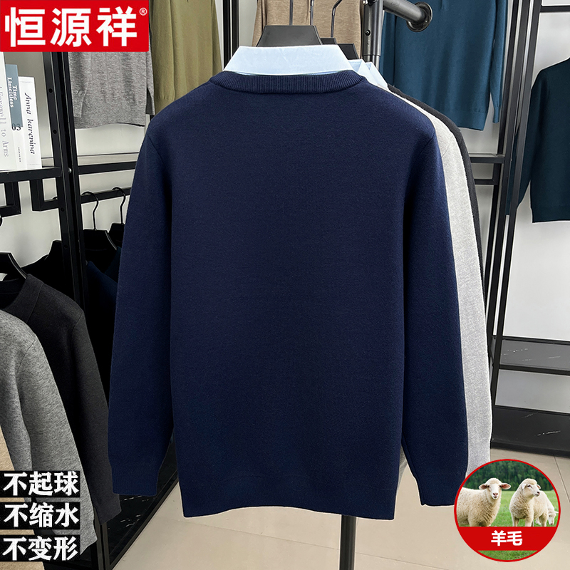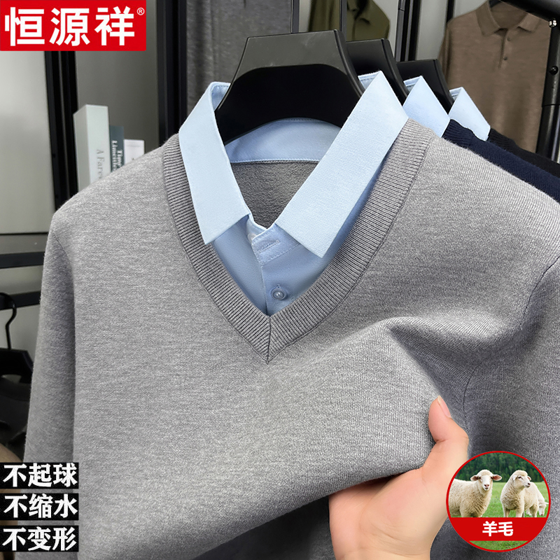 恒源祥100%纯羊毛衫男假两件毛衣冬季中老年爸爸装加厚针织打底衫