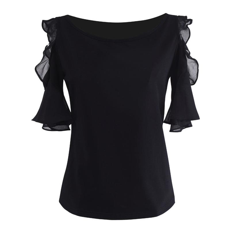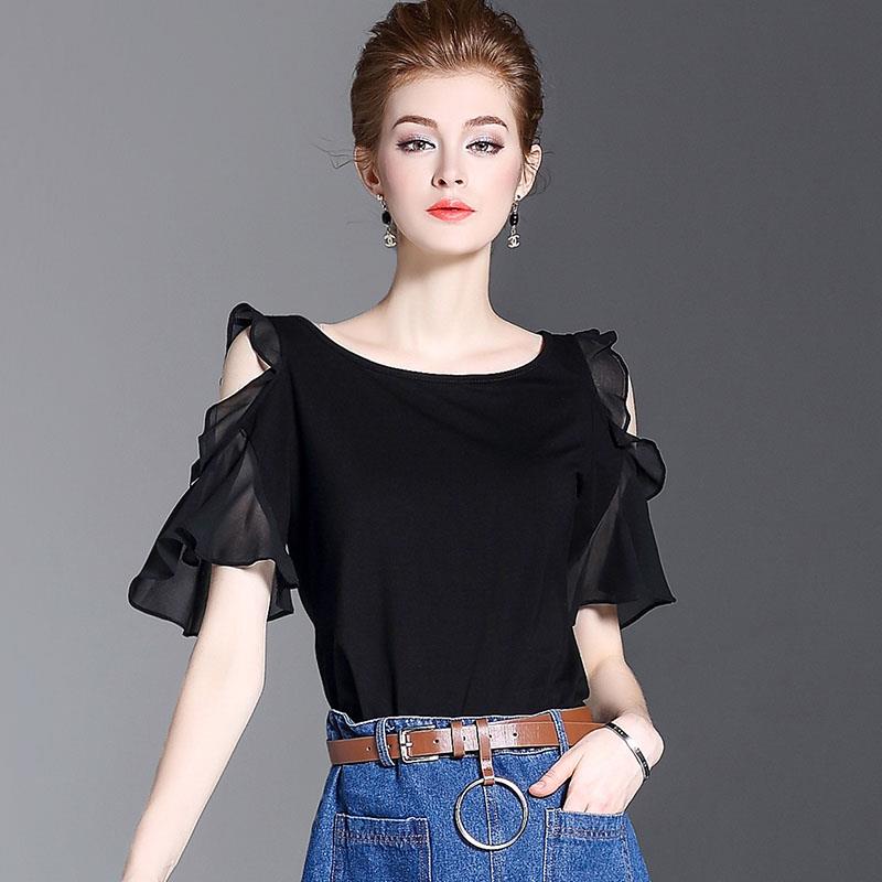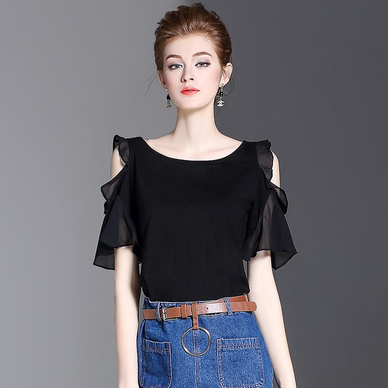 黑色一字领雪纺荷叶露肩上衣性感体恤夏季修身显瘦纯棉t恤女短袖