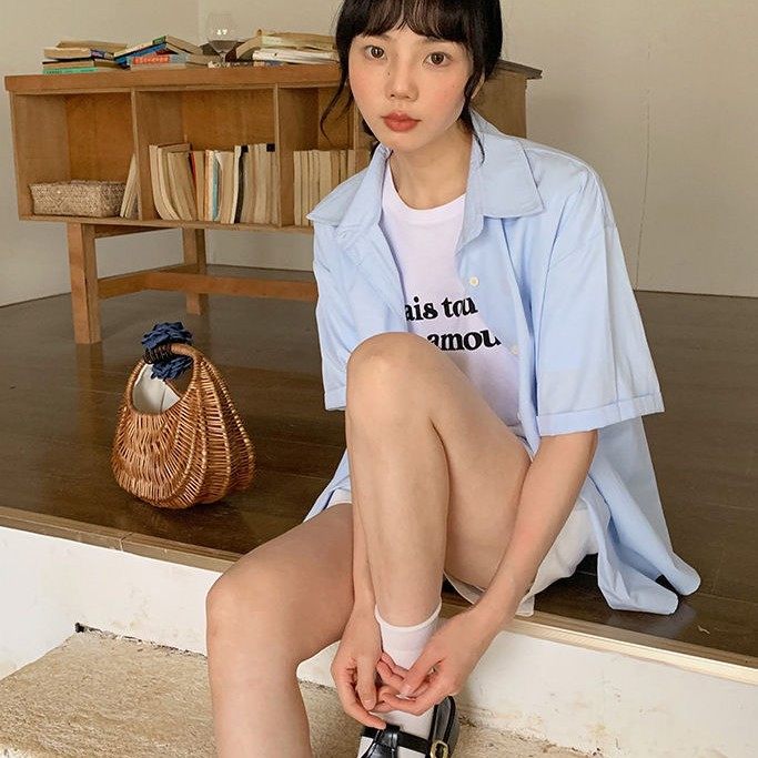 夏季浅蓝色衬衫女短袖宽松显瘦时尚学生港风衬衣百搭夏天薄款上衣