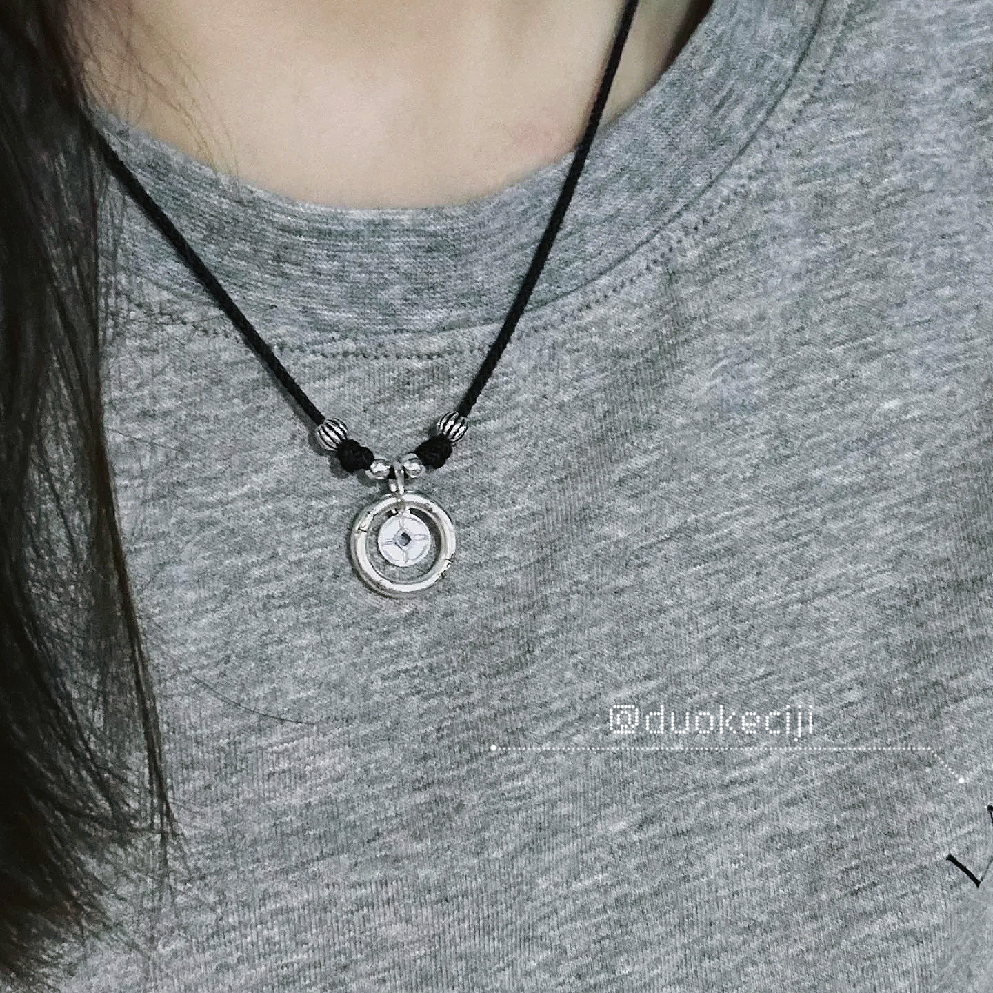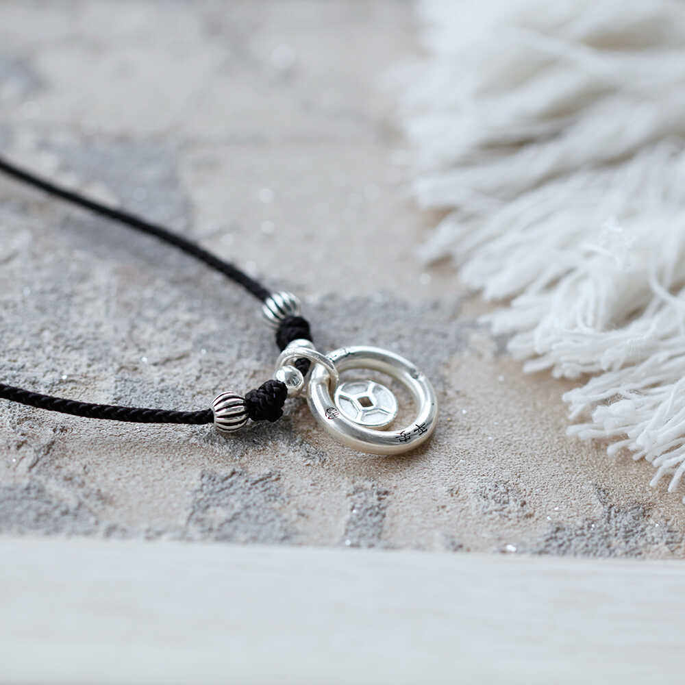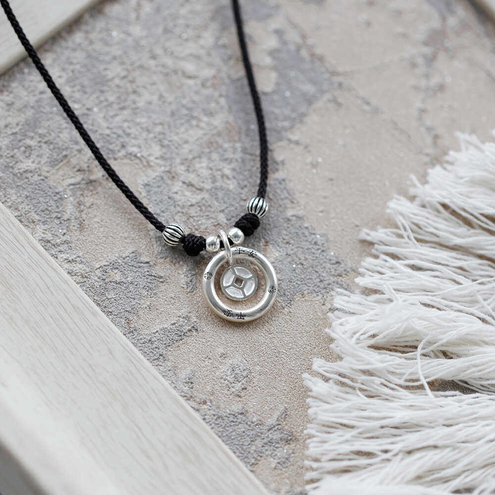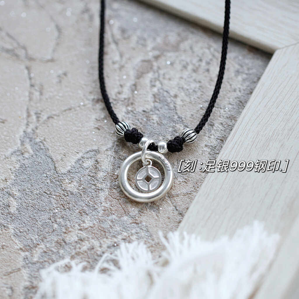 平安聚财足银999实心平安扣镶嵌钱币 纯银吊坠黑绳项链男女款挂坠
