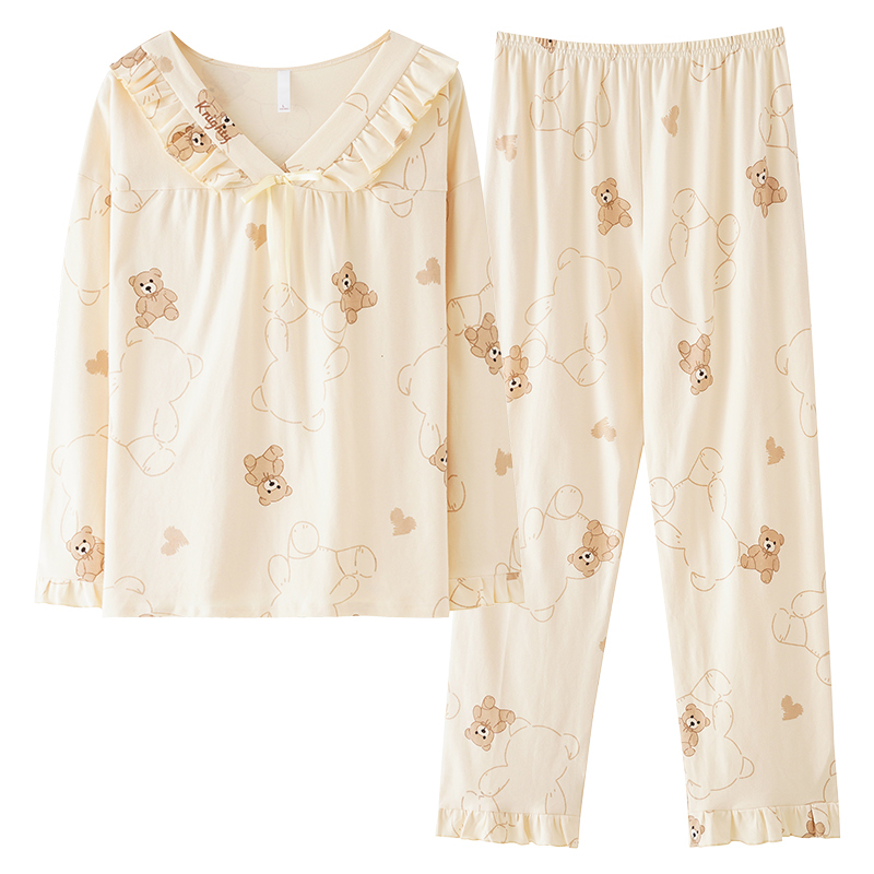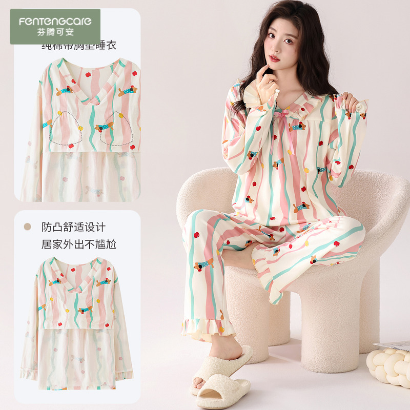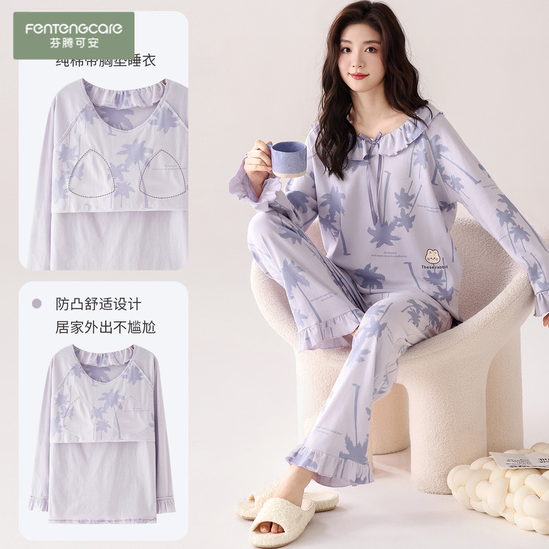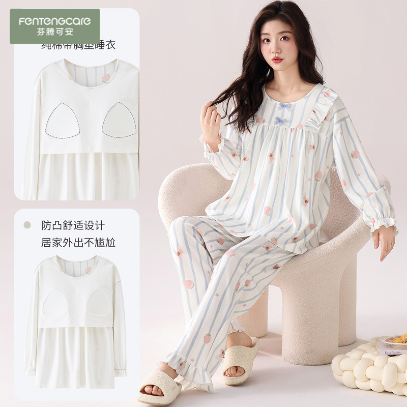 芬腾可安睡衣女款纯棉长袖春秋2025新款带胸垫公主风家居服女套装