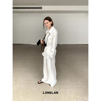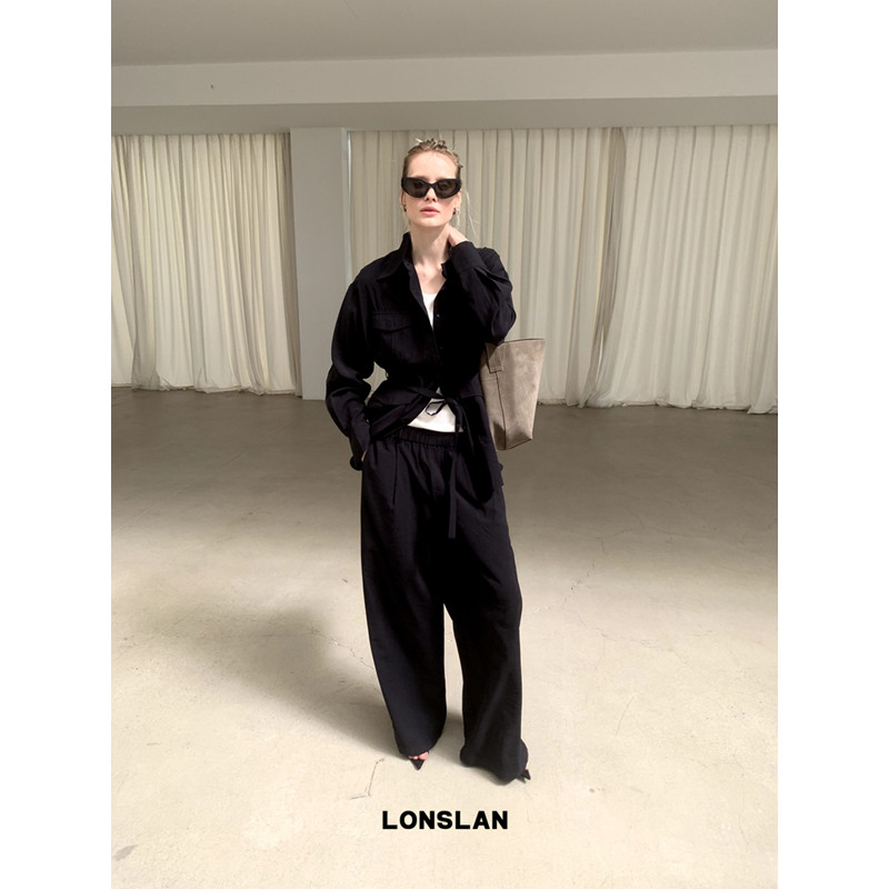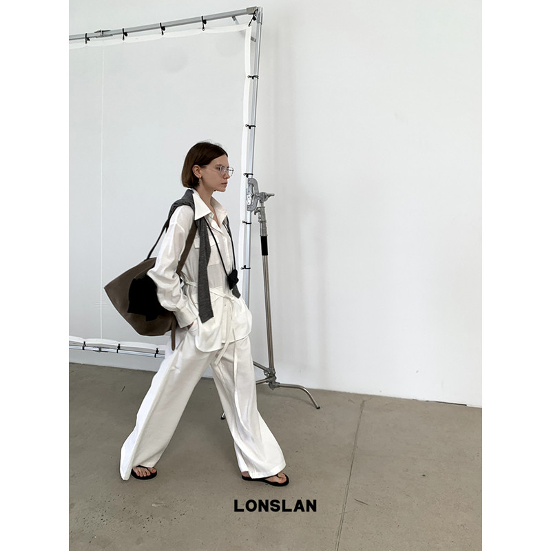 LONSLAN 2024秋季新款简约高质感口袋绑带棉麻垂感衬衫阔腿裤套装