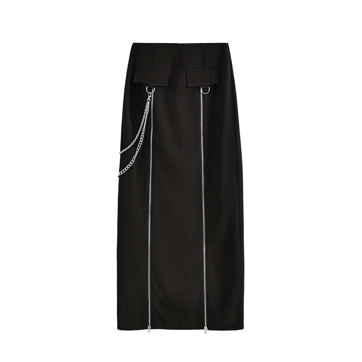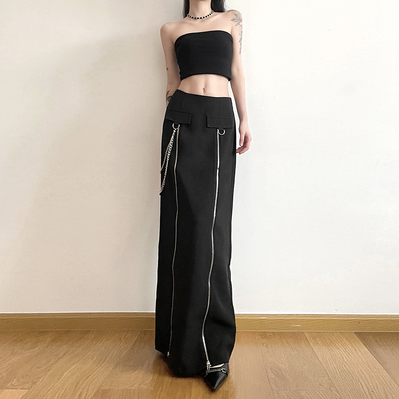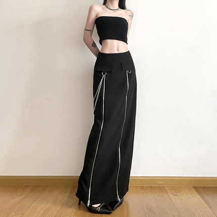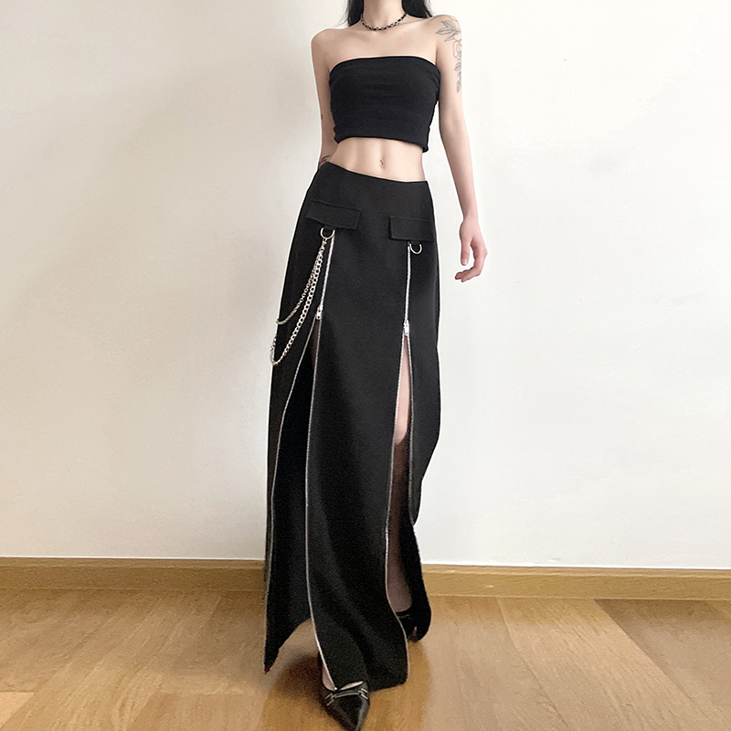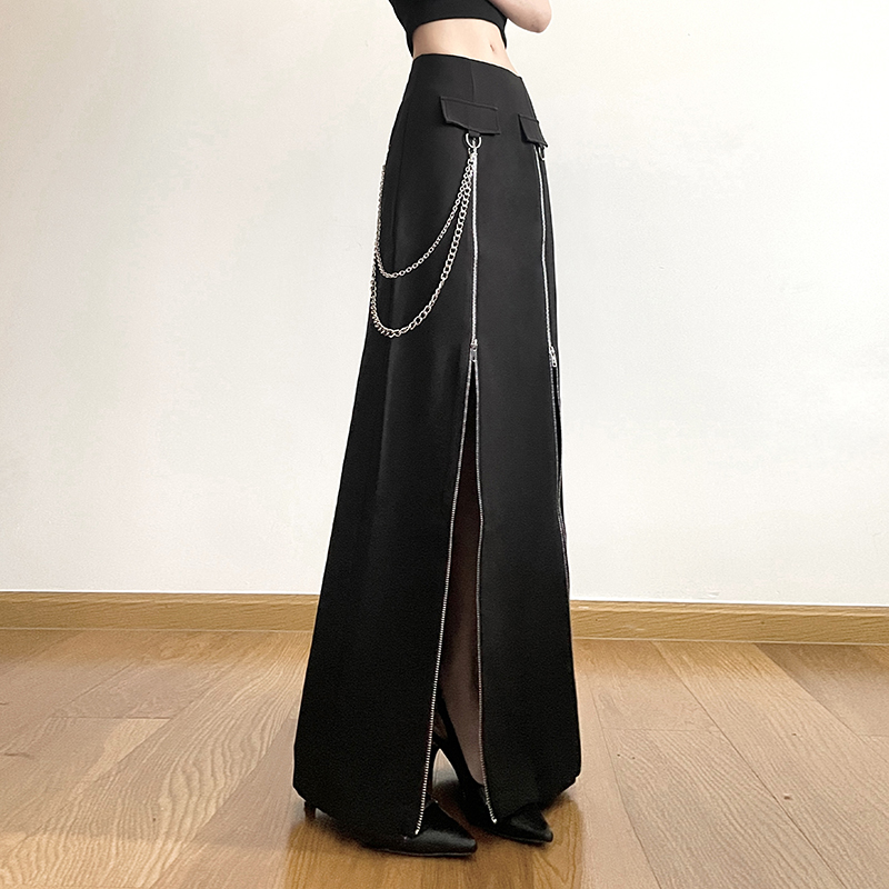 gagaopt自制新款设计感双拉链开叉黑色半身裙高腰显瘦直筒长裙春