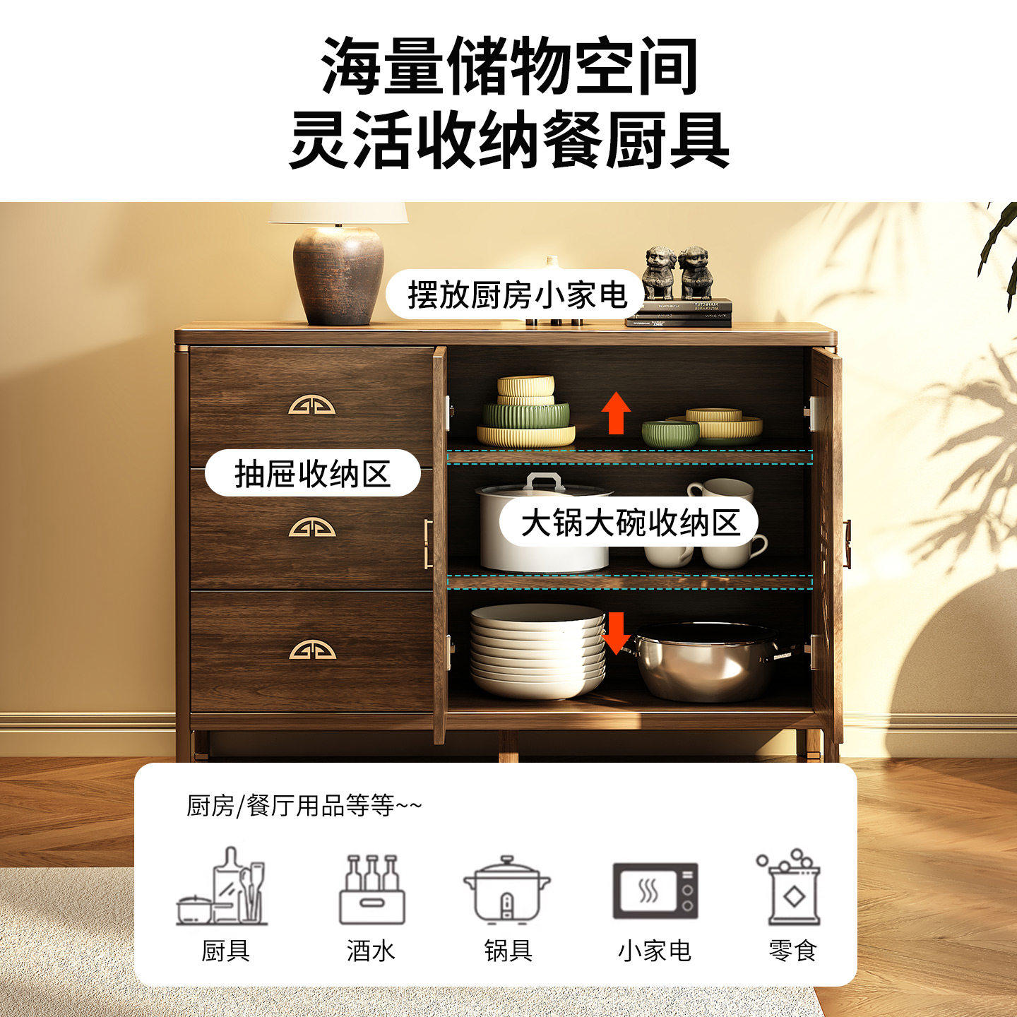 实木餐边柜靠墙一体储物柜新中式家用客厅酒柜茶水柜多层置物橱柜