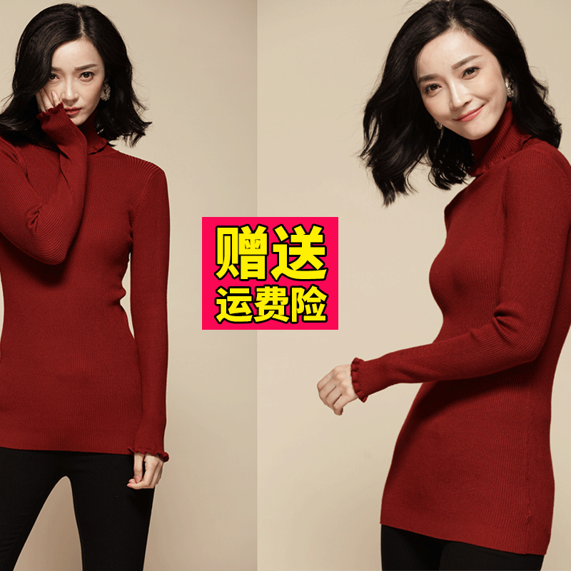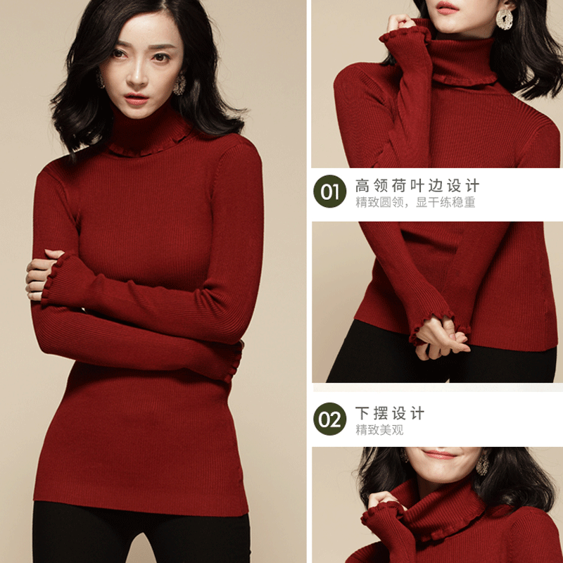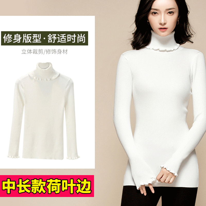 大码慵懒风毛衣女打底针织衫胖mm荷叶边高领修身毛线衣中长款冬季
