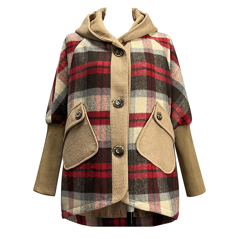 插肩袖格子毛呢连帽大衣女2024秋冬宽松大版型单排扣松紧袖外套