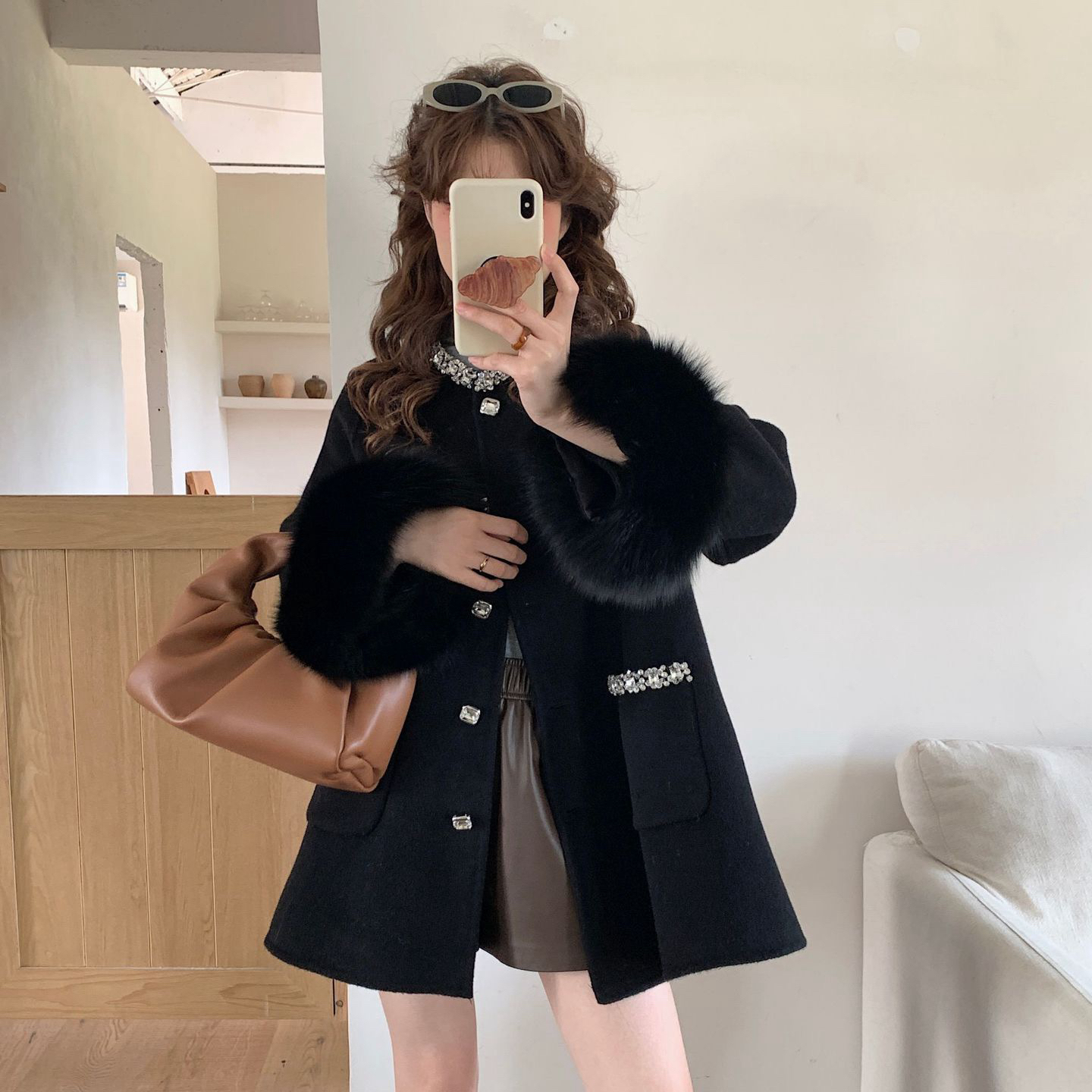 欧洲站2025新款韩系钉珠双面羊毛大衣狐狸毛皮草外套女圆领中长款