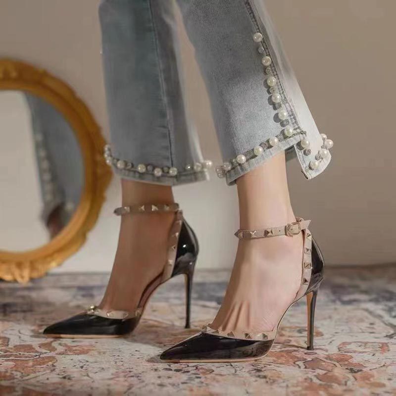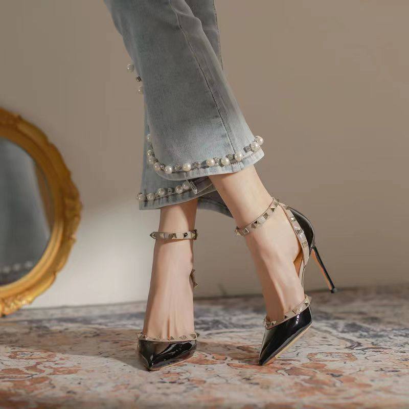 2025年新款铆钉一字带中空单鞋女性感不累脚包头凉鞋女细跟高跟鞋