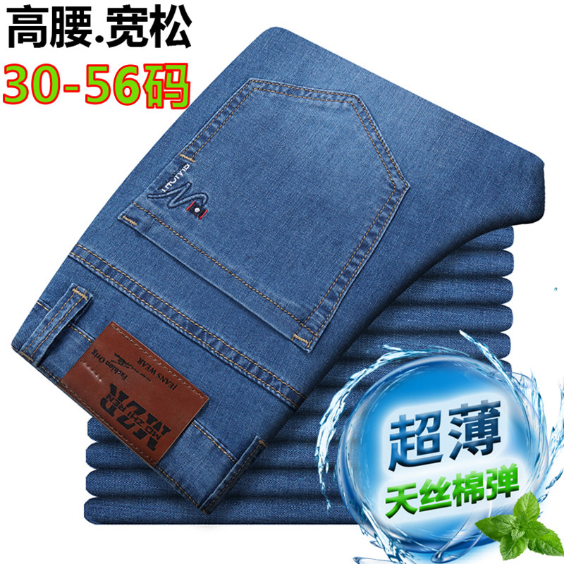 夏季高弹力胖人加肥加大码直筒宽松高腰肥佬牛仔裤男士中年休闲裤