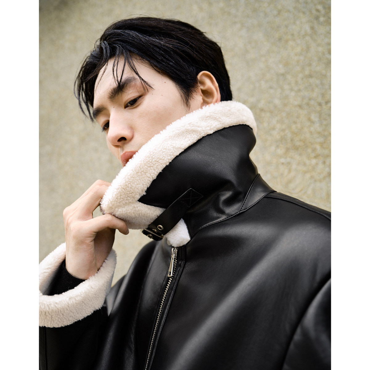 【明星同款】太平鸟男装PU皮夹克新款仿羊羔毛外套衣宽松机车服