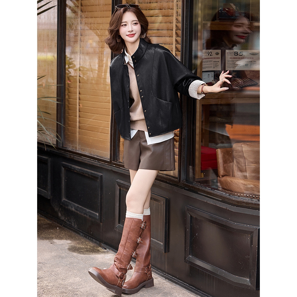 韩系皮夹克外套女2025秋季新款女装长袖休闲百搭短款格纹卷袖皮衣