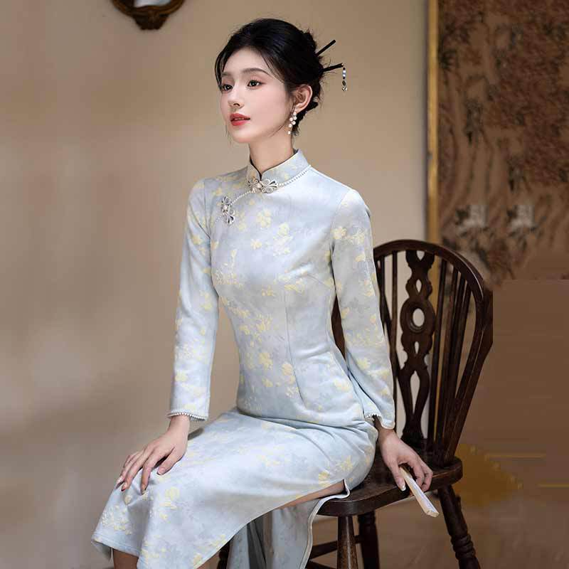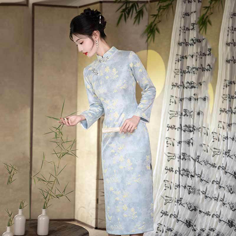 蓝色国风中式秋季长袖旗袍改良年轻款新款女复古修身收腰秋冬高级