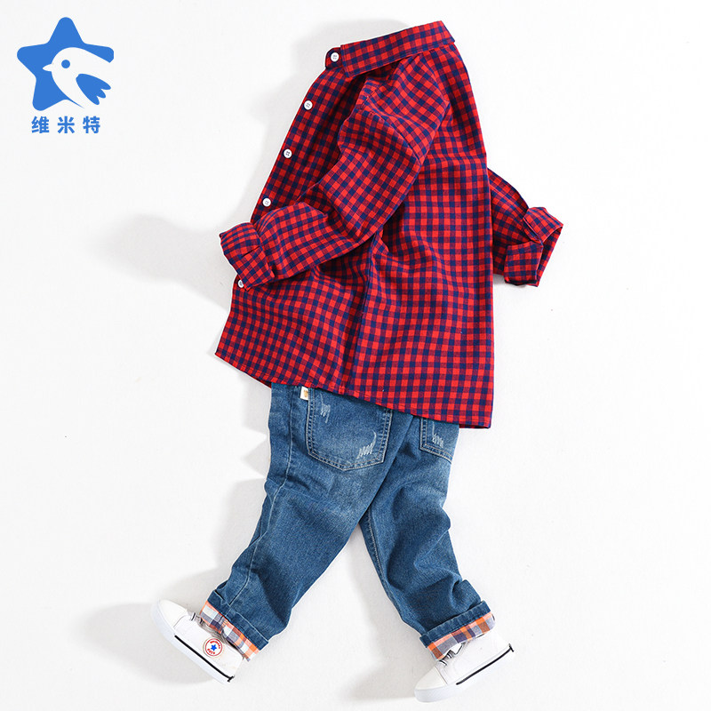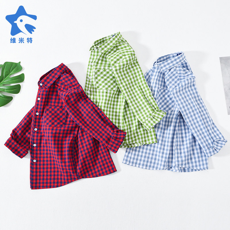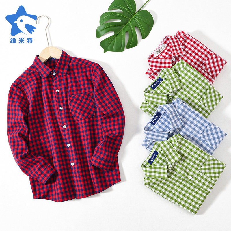 儿童装休闲纯棉长袖衬衫男童细格子衬衣女童休闲上衣春秋季中大童