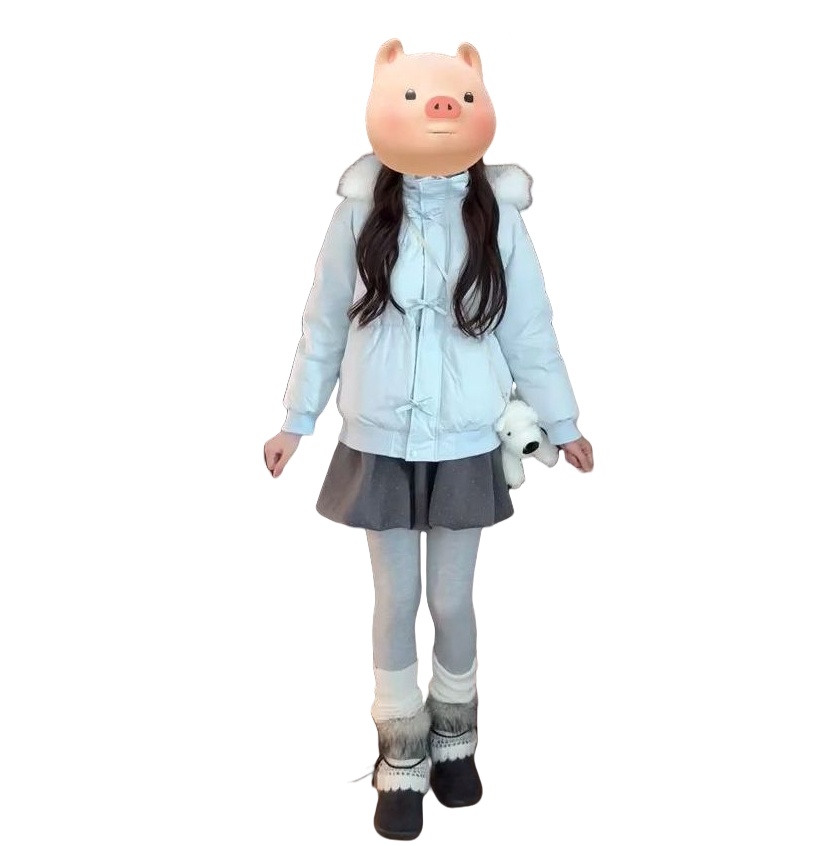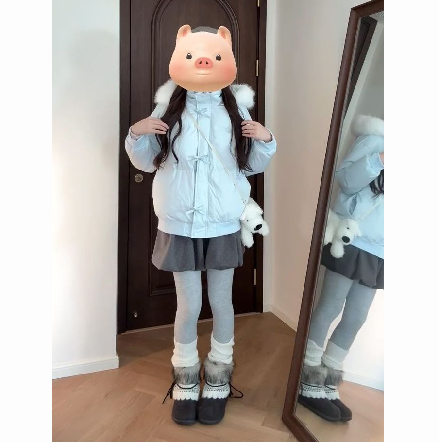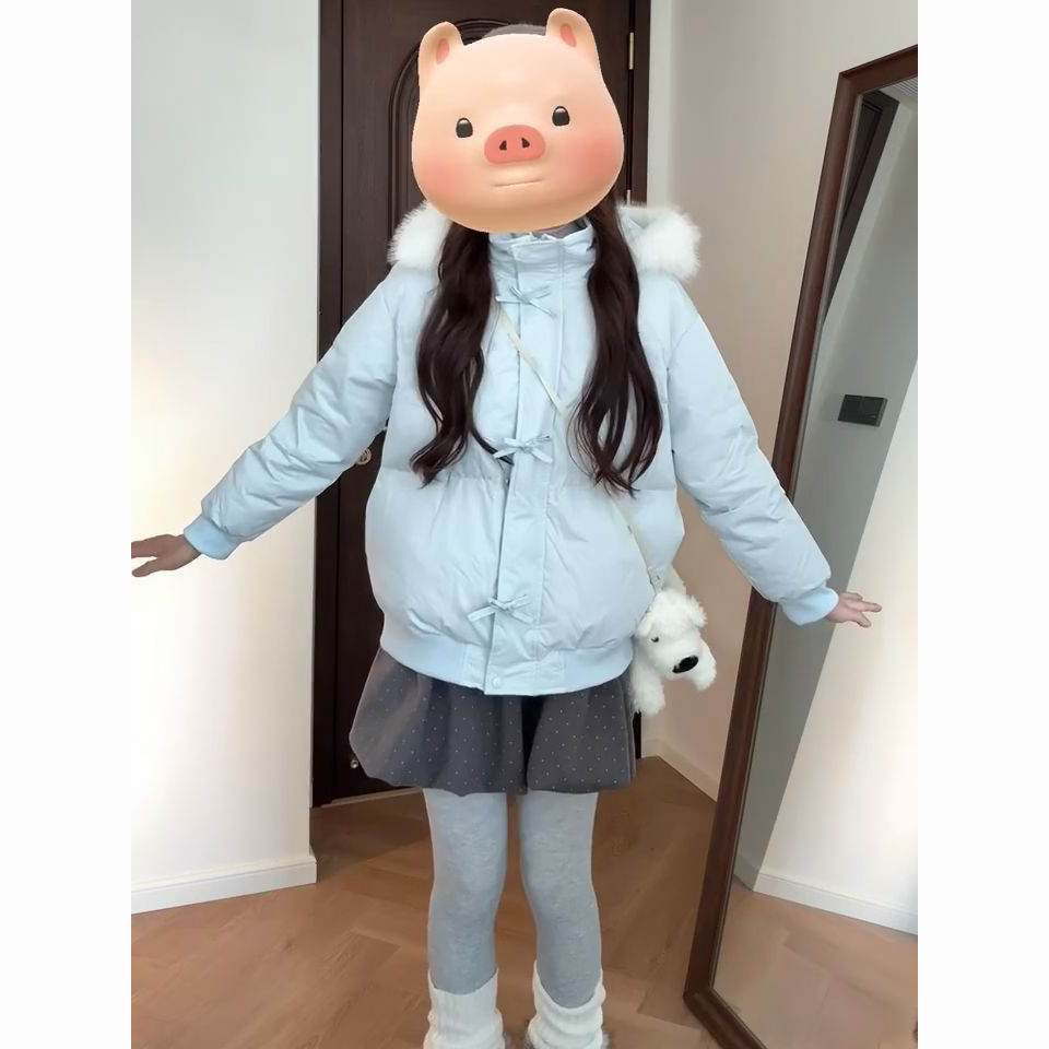 冬季甜美慵懒风毛领蓝色连帽棉服外套女新款百搭蝴蝶结保暖面包服