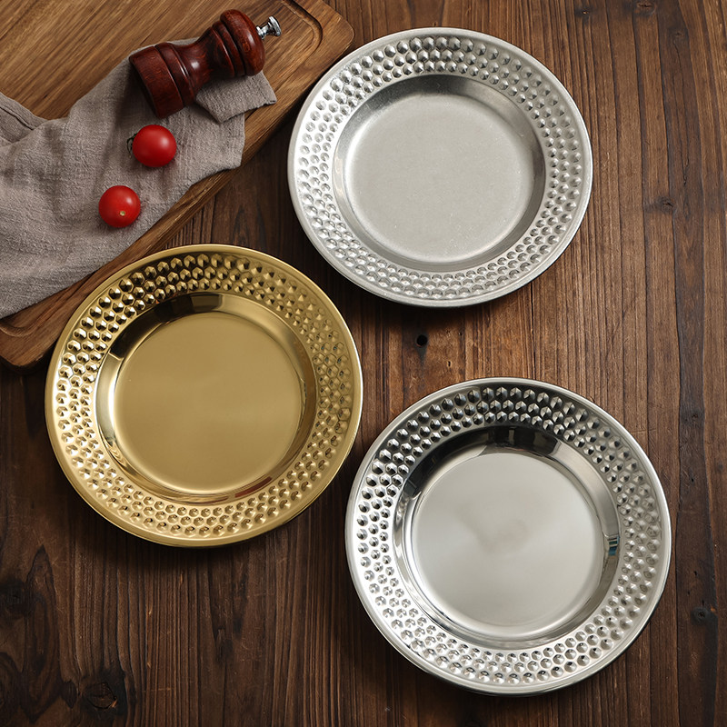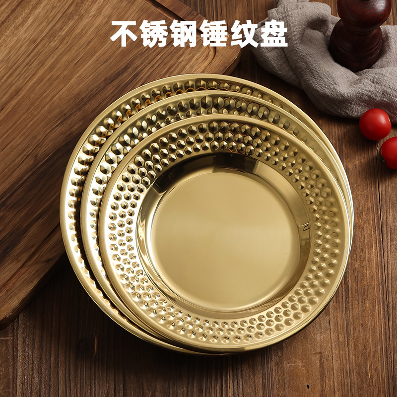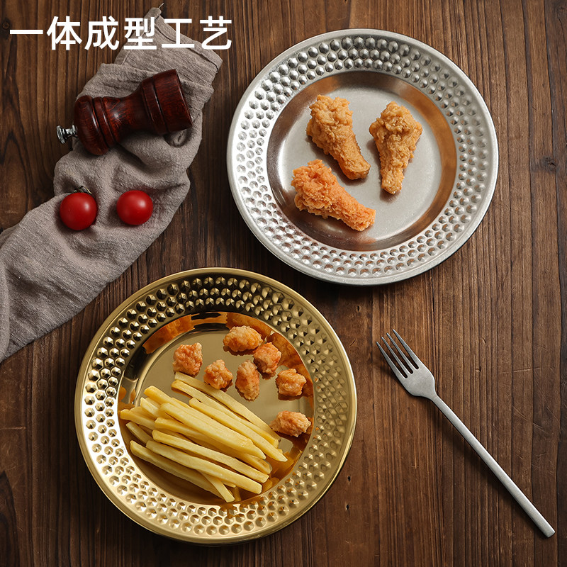韩式不锈钢锤纹盘钻纹花边水果盘蛋糕盘甜品盘圆盘复古小吃盘浅盘