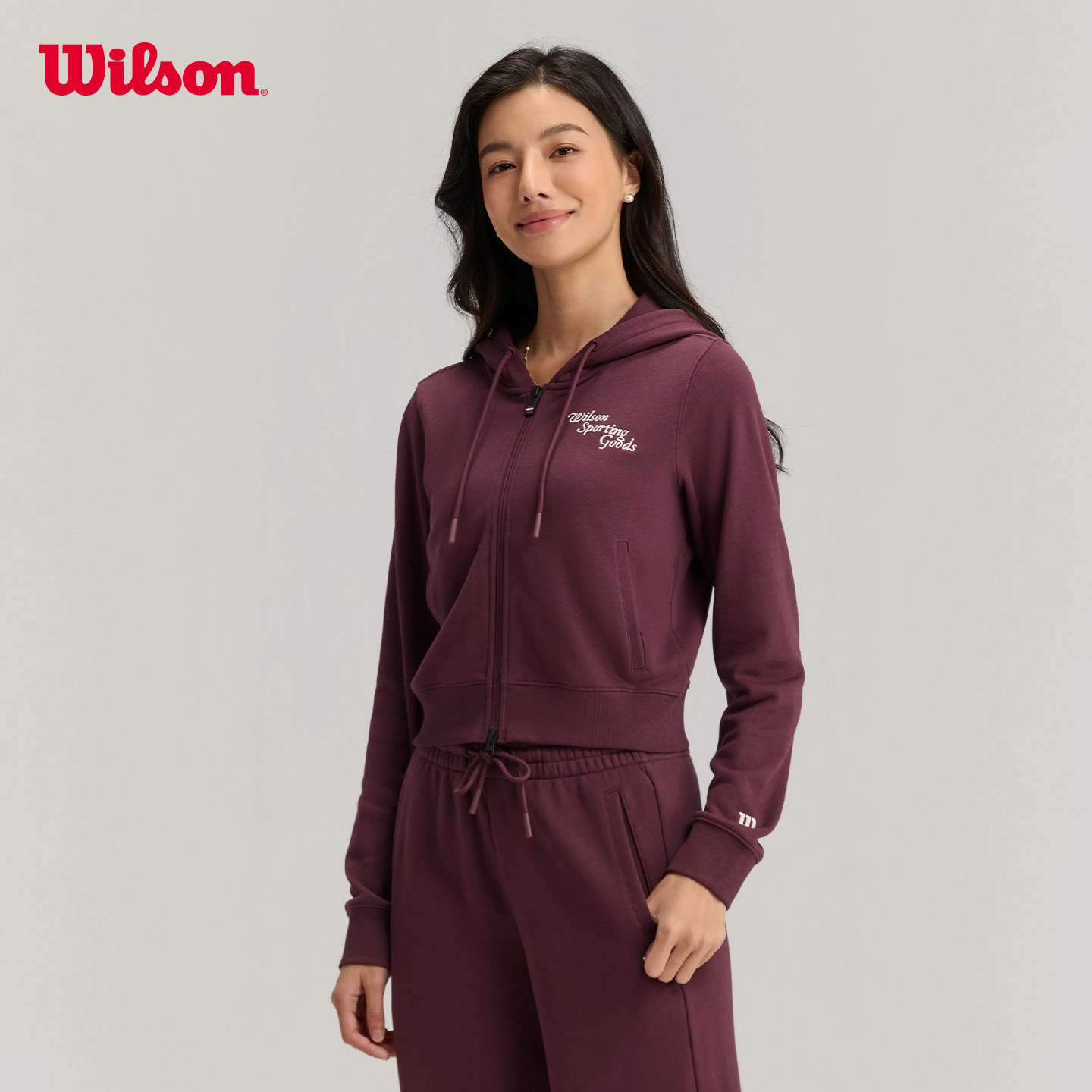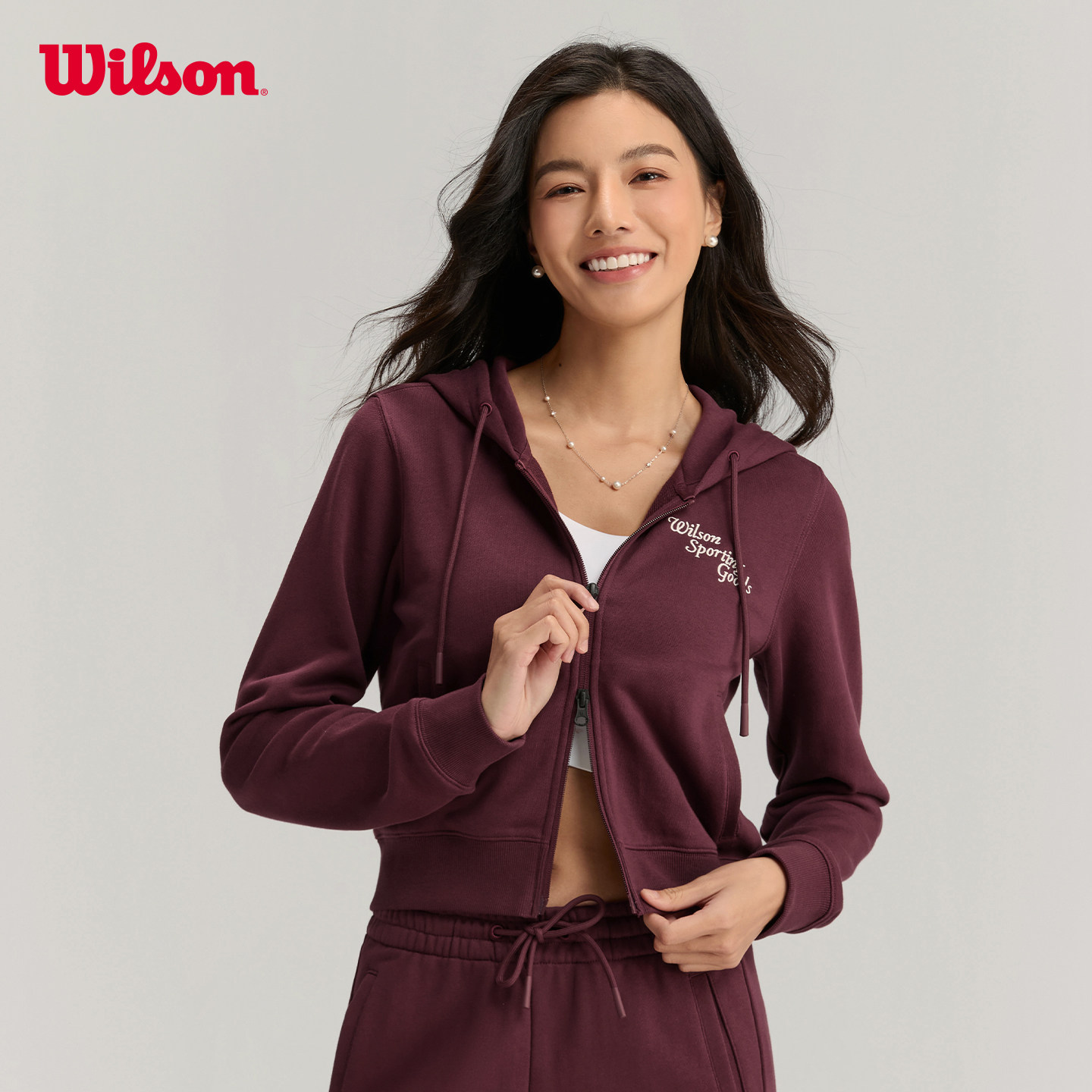 Wilson威尔胜官方春季女士复古连帽修身短款拉链百搭针织卫衣外套