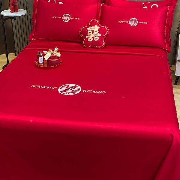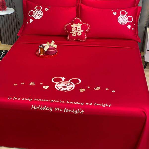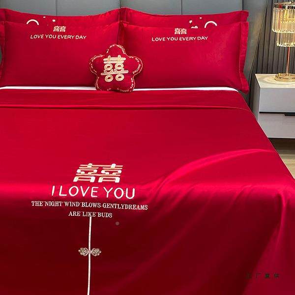 大单婚庆床单件结喜庆被单枕套红三件婚F6M96062套喜字刺绣酒店新