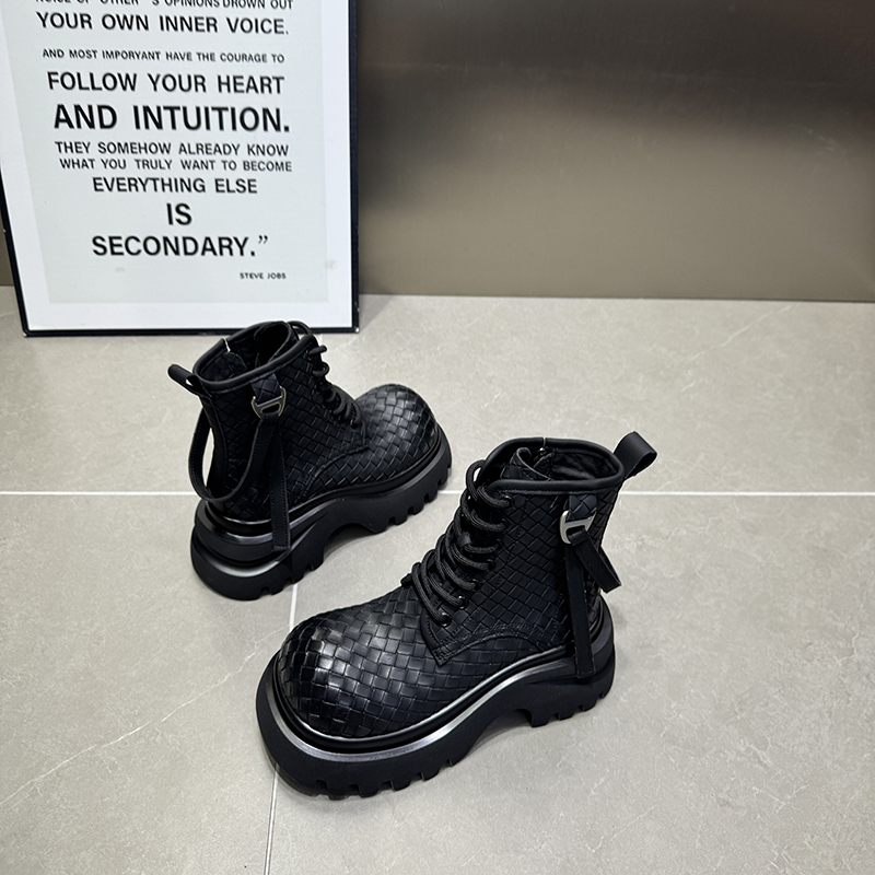 25秋季新款百搭编织圆头马丁靴真皮女机车靴子厚底短靴子1819-27