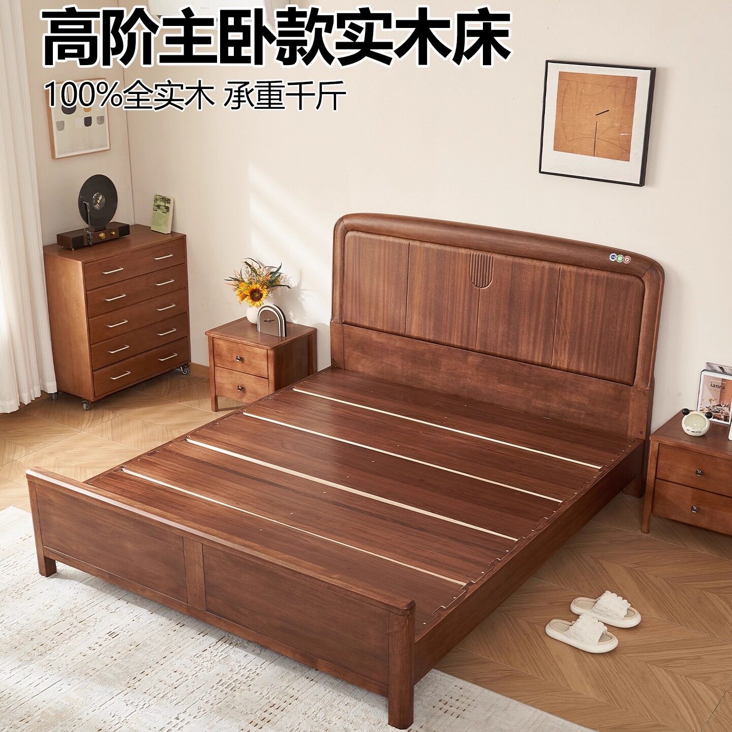 胡桃木实木床新中式1.8米满铺榫卯卧室床1.5米现代简约储物双人床