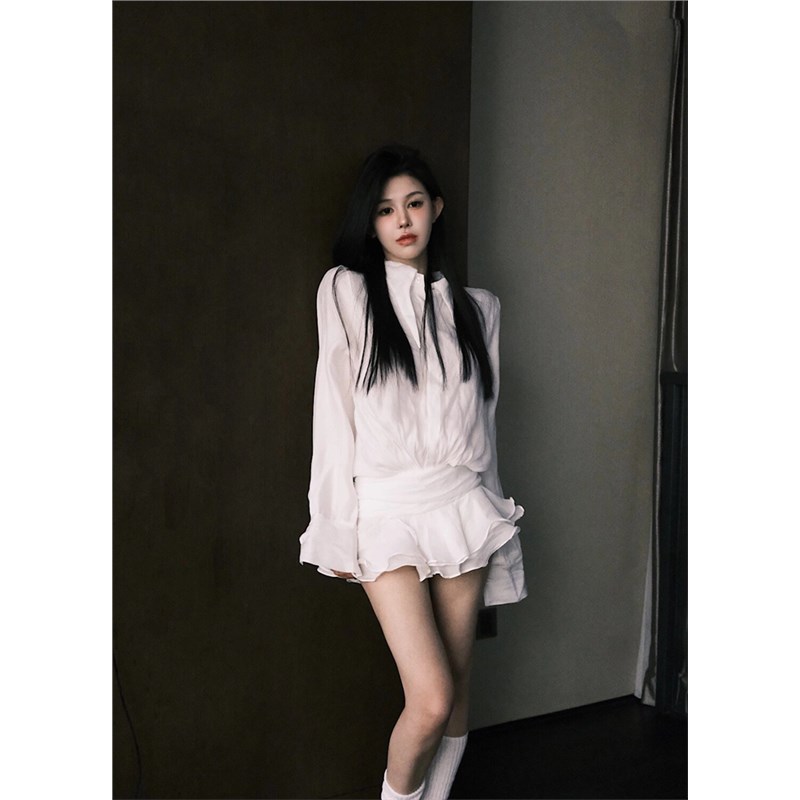 白色衬衫连衣裙女秋冬新款性感浪漫V领气质修身显瘦荷叶边短裙子