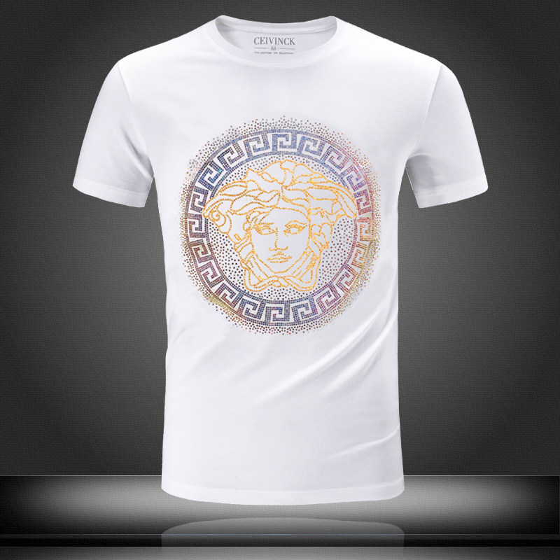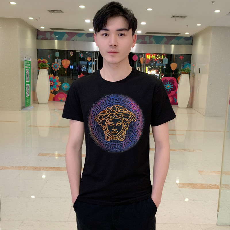 夏装T恤男装潮牌刺绣烫钻冰丝圆领修身款轻奢流行半袖T恤欧洲站
