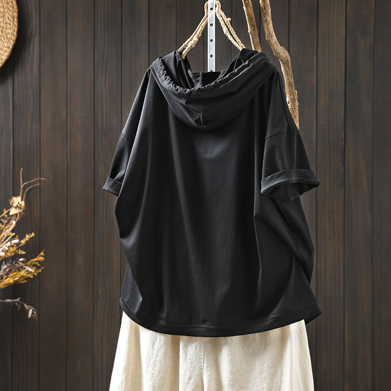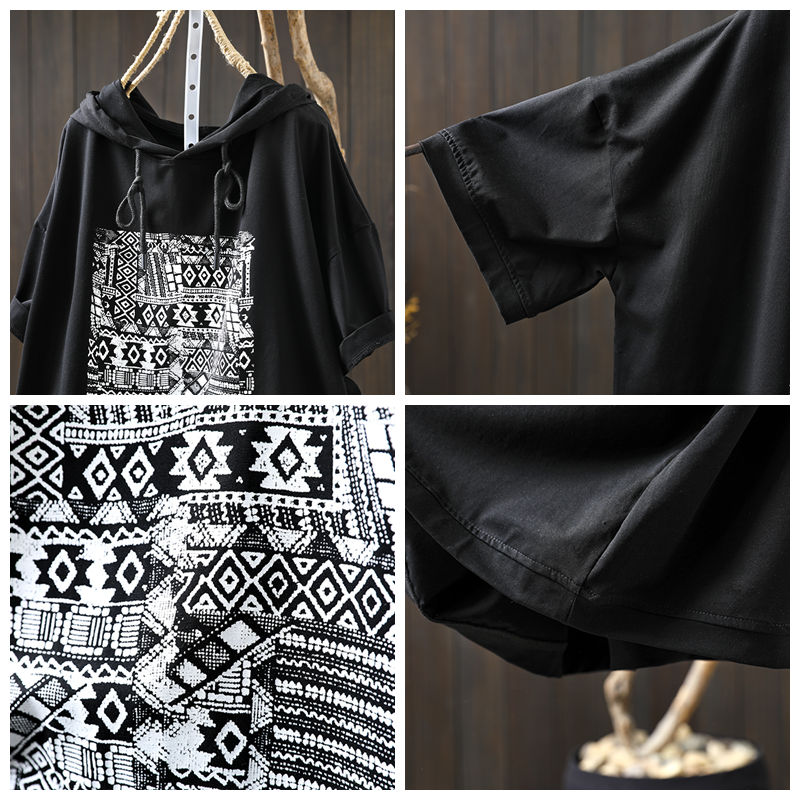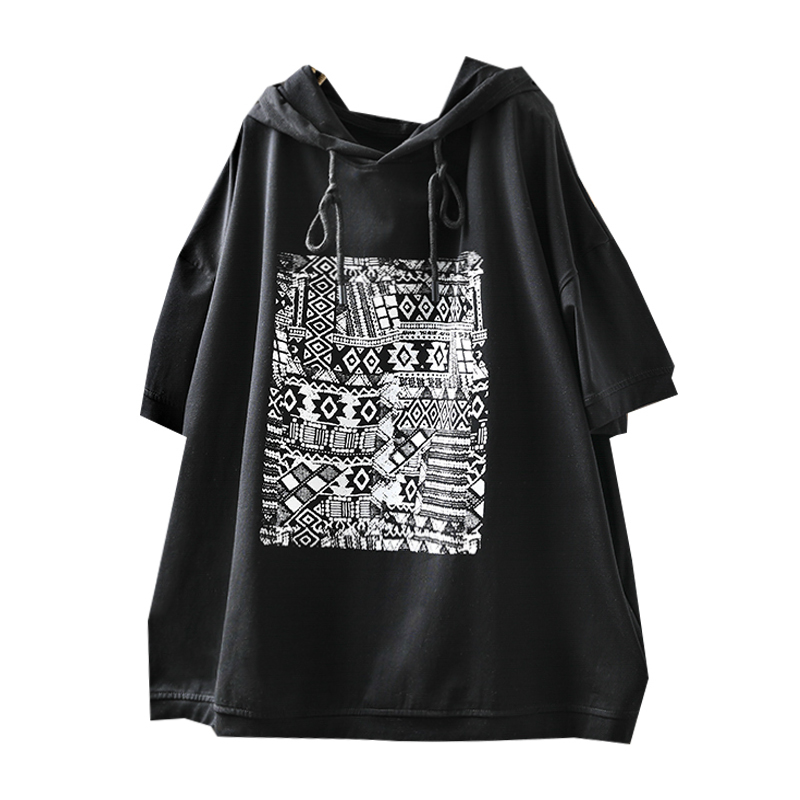 字母印花连帽短袖t恤女小个子2025新夏宽松大码遮肉休闲套头上衣