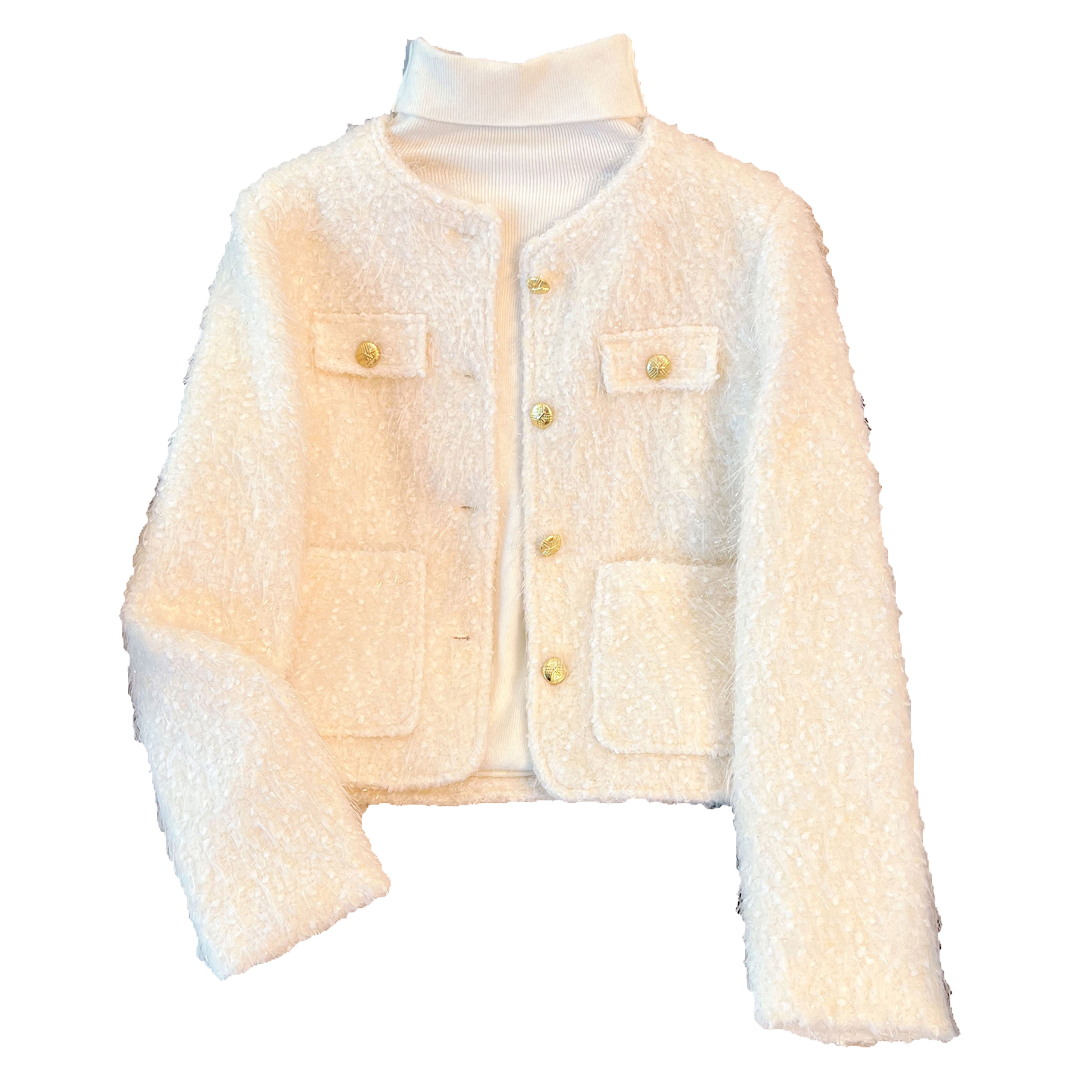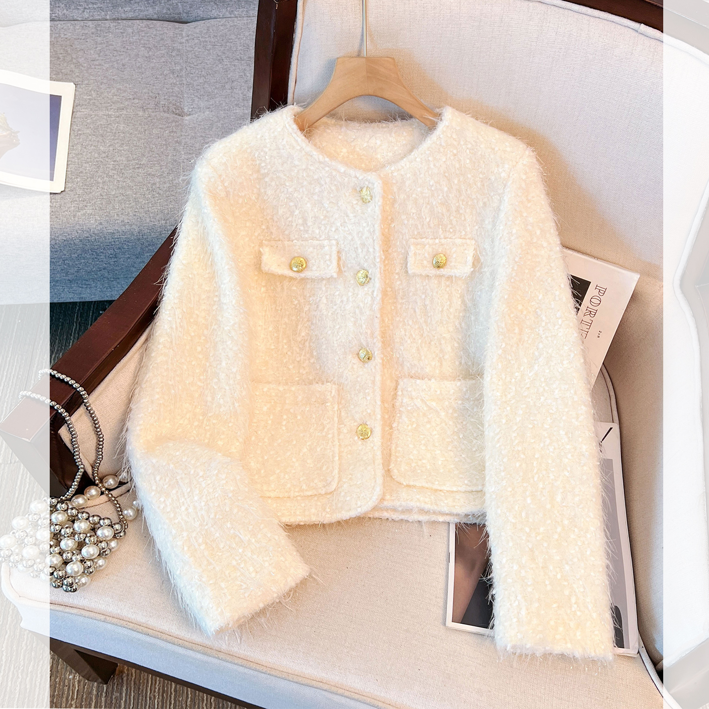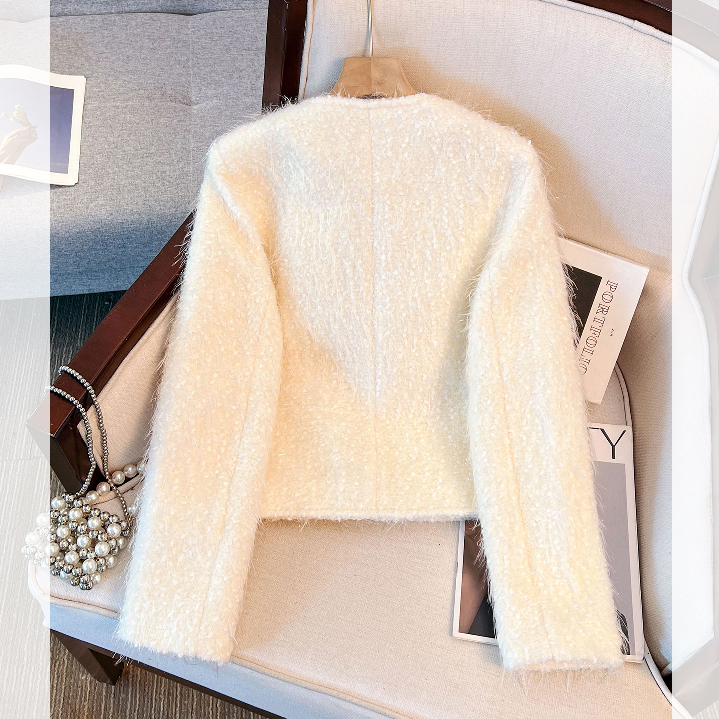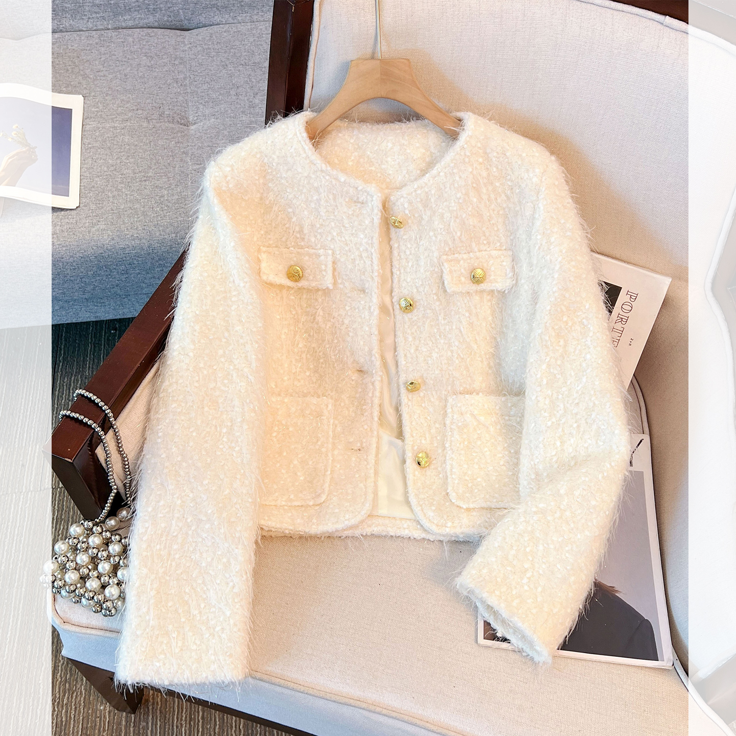法式小资圆领正肩毛呢厚外套女2025深秋初冬新短款小香风呢子大衣