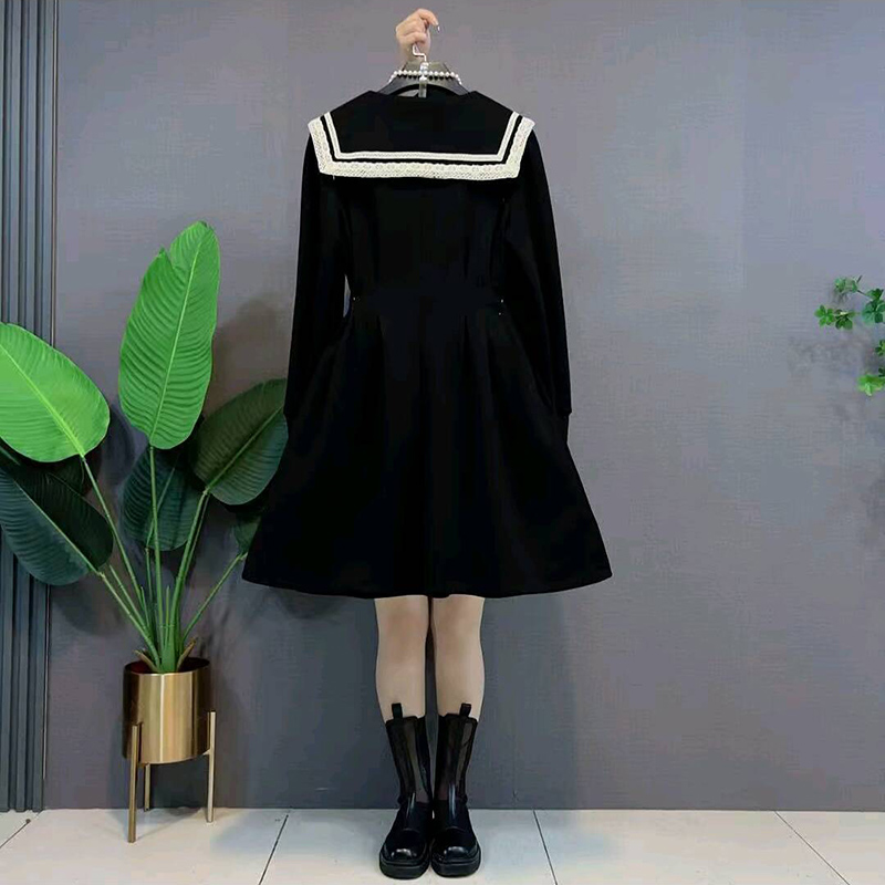 欧货爆款时尚拼色海军领中长款连衣裙秋冬新款宽松显瘦洋气A字裙