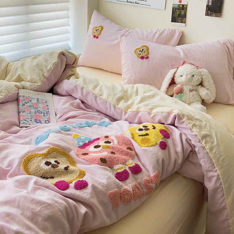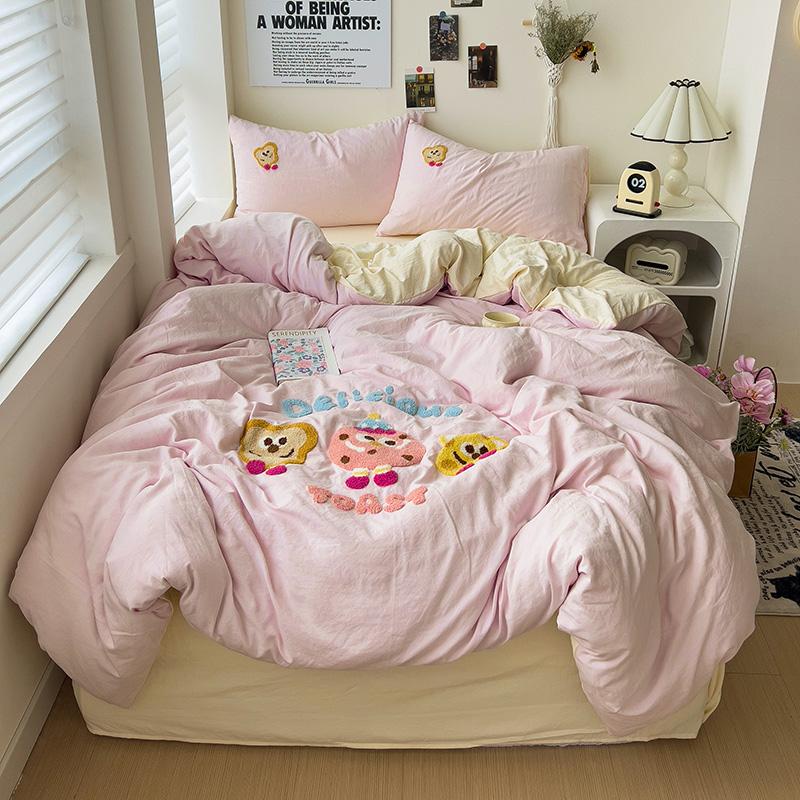 超级柔软的纯色水洗棉四件套 ins可爱卡通毛巾绣花被套奶油色床单