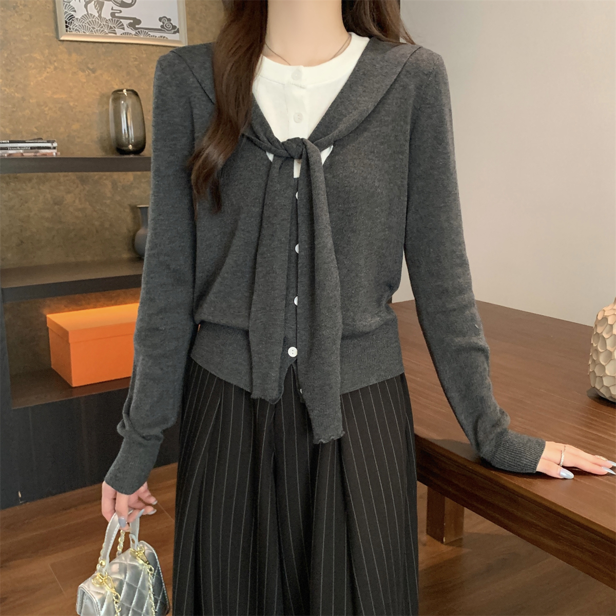 秋冬季韩系学院风披肩假两件圆领撞色针织开衫软糯打底毛衣女内搭