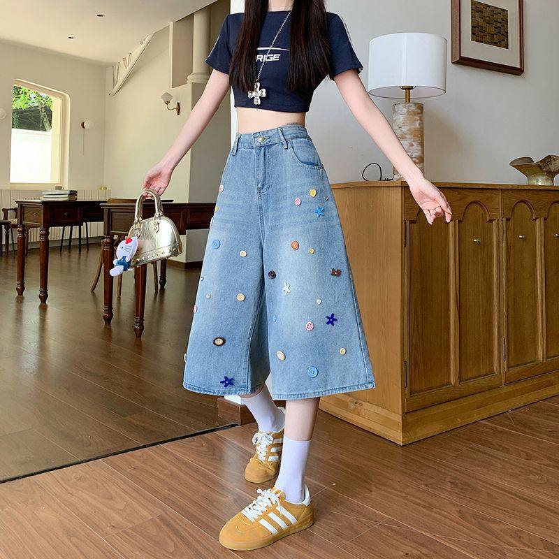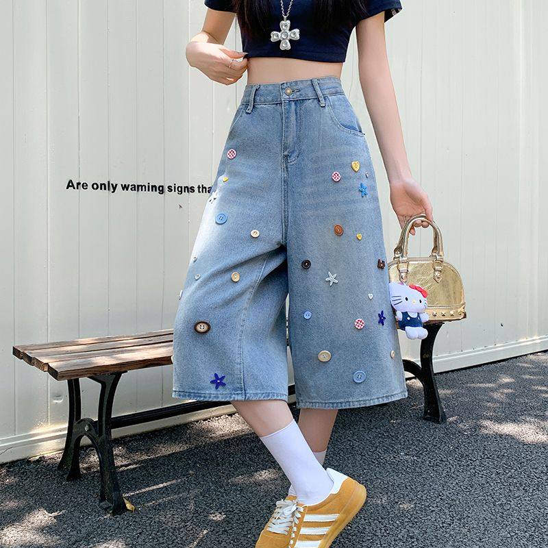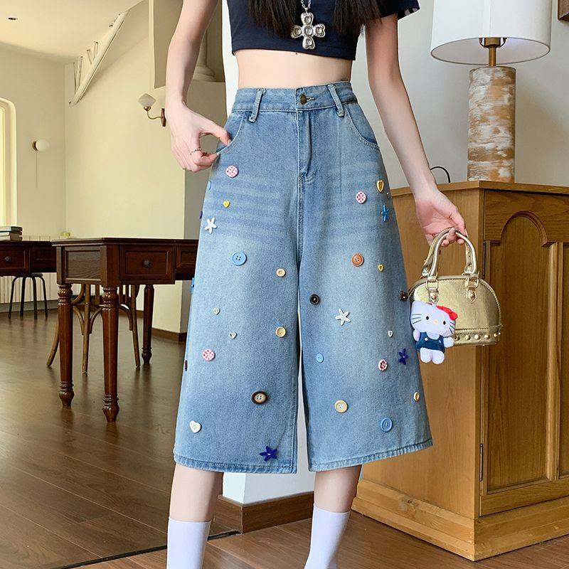 设计感彩色纽扣牛仔短裤女夏季2026新款高腰显瘦宽松直筒七分裤子