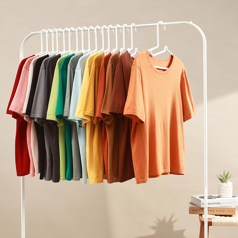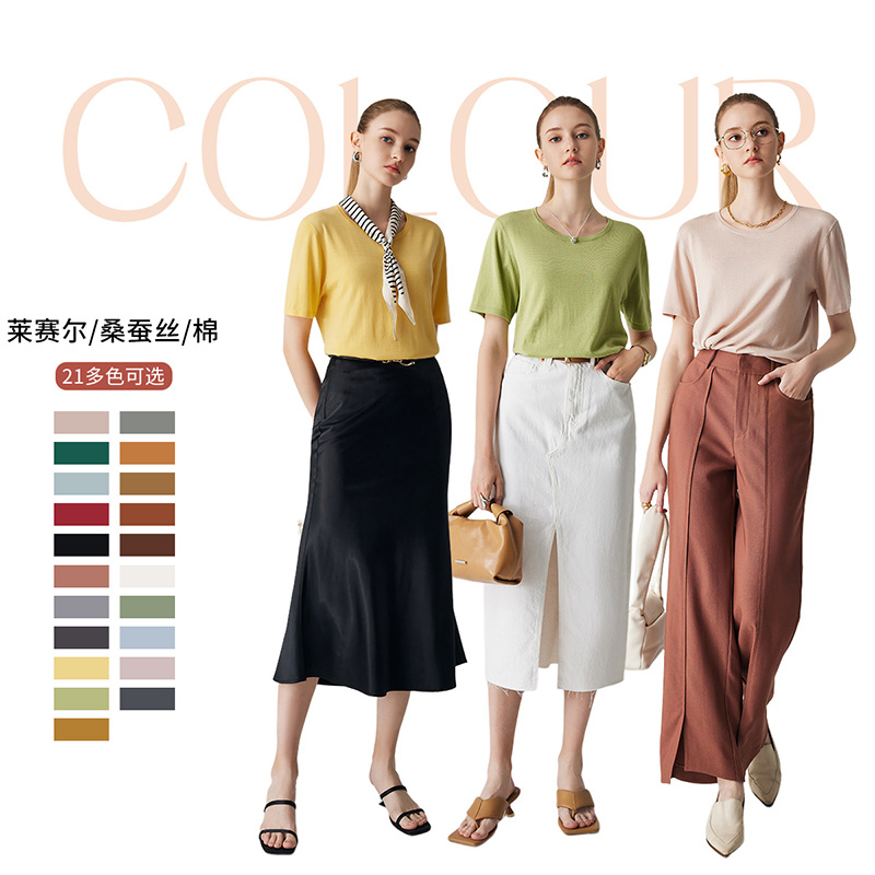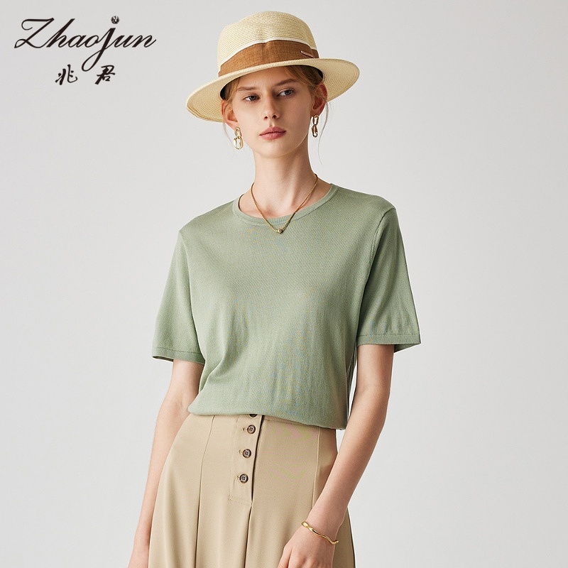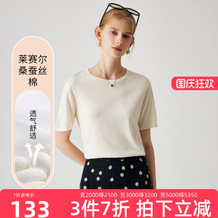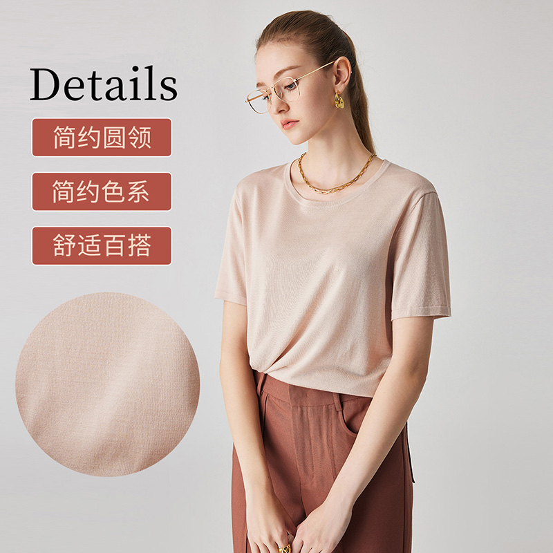 兆君春夏新款莱赛尔天丝短袖针织衫T恤女圆领含桑蚕丝上衣
