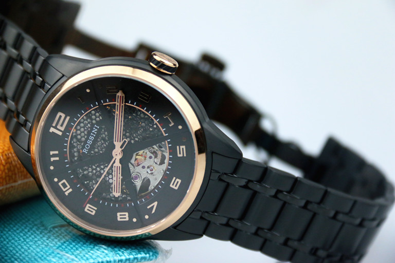罗西尼机械机芯男表时尚商务炫黑个性精致镂空钢带防水手表5821