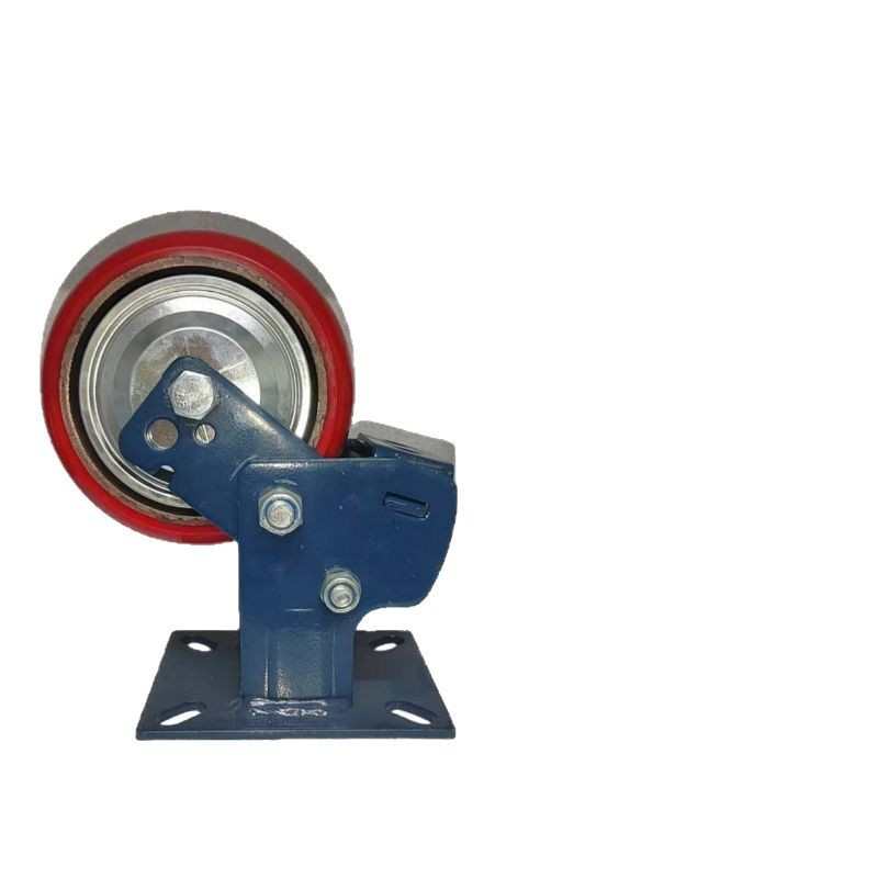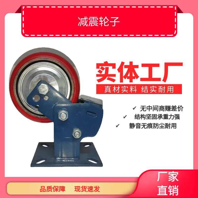 双簧4568寸红色聚氨酯减震轮重型脚轮耐磨带刹车减震弹簧PU万向轮