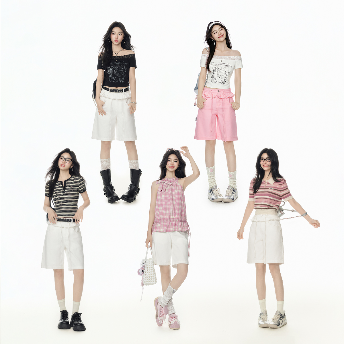 EPTISON牛仔短裤女2025夏新款纯棉少女风百褶拼接白色直筒五分裤
