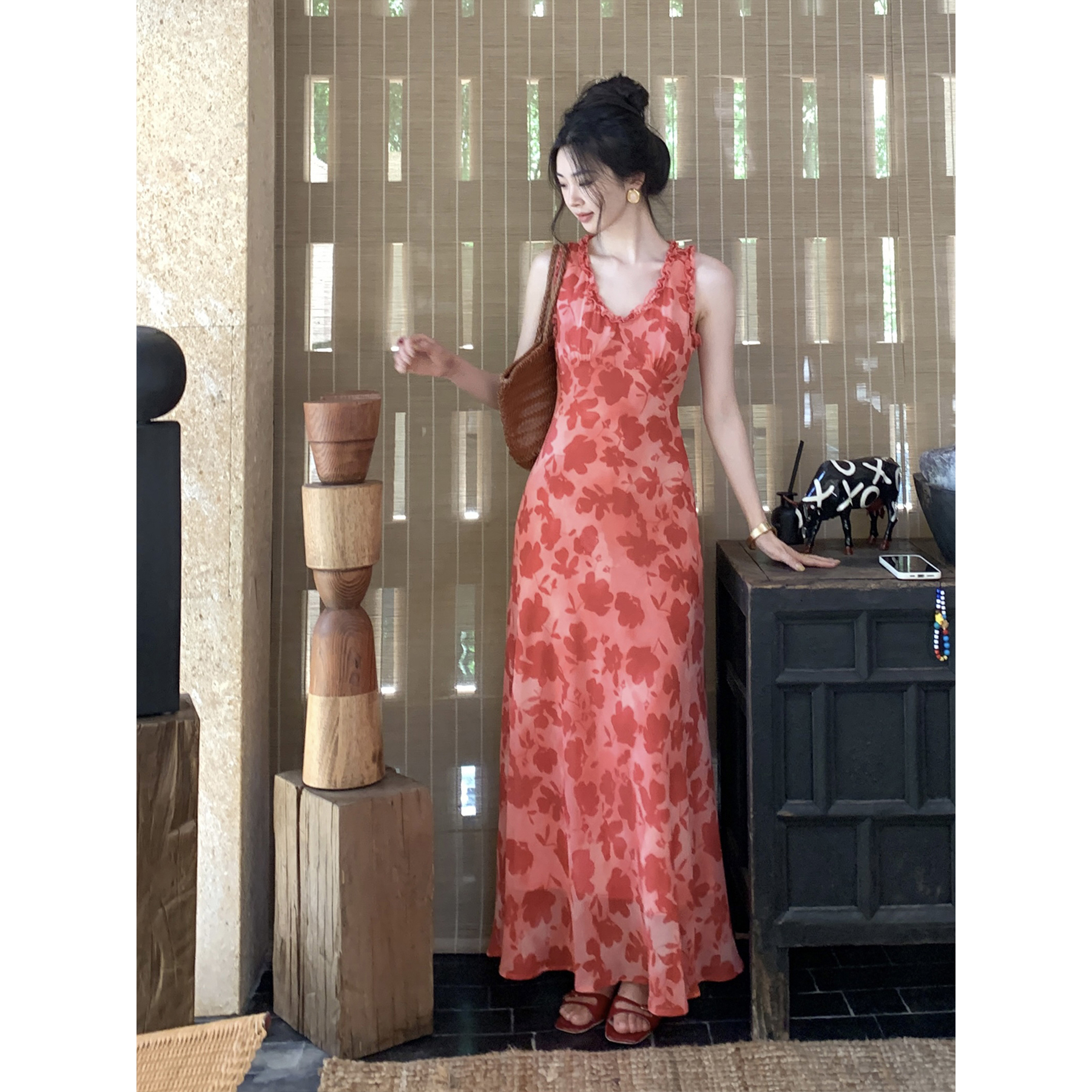 SYT原创 木耳边雪纺碎花连衣裙女2025夏季新款轻薄透气收腰长裙