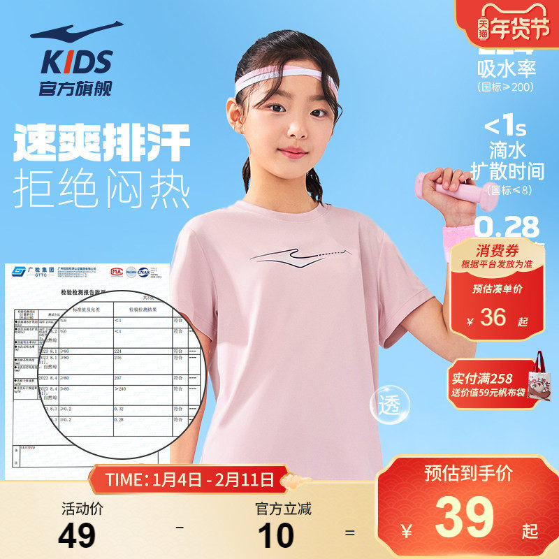 鸿星尔克童装女童冰爽短袖T恤儿童运动速干衣夏季轻薄透气上衣
