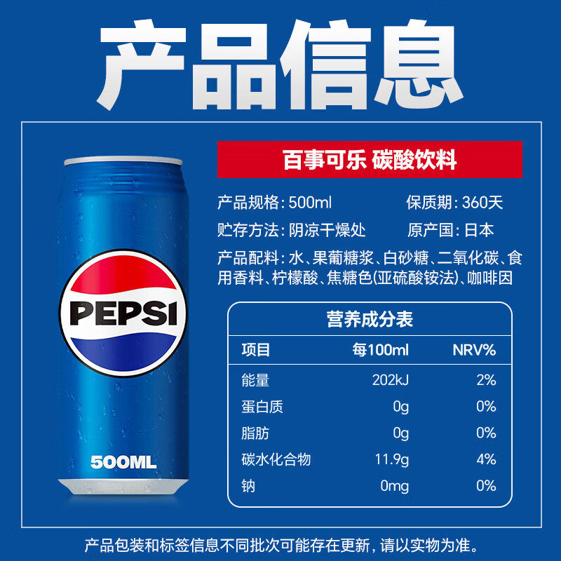 日本进口pepsi百事可乐原味可乐碳酸饮料气泡水500ml*6罐