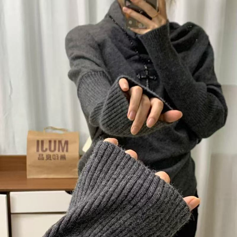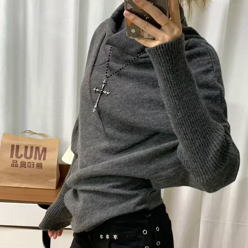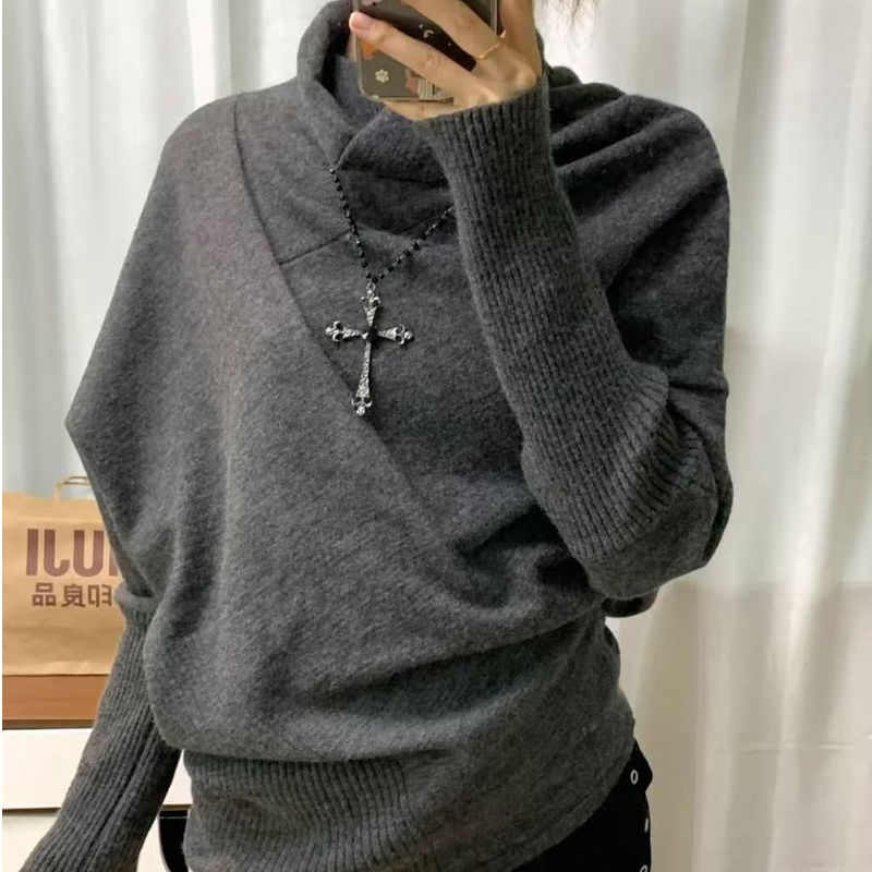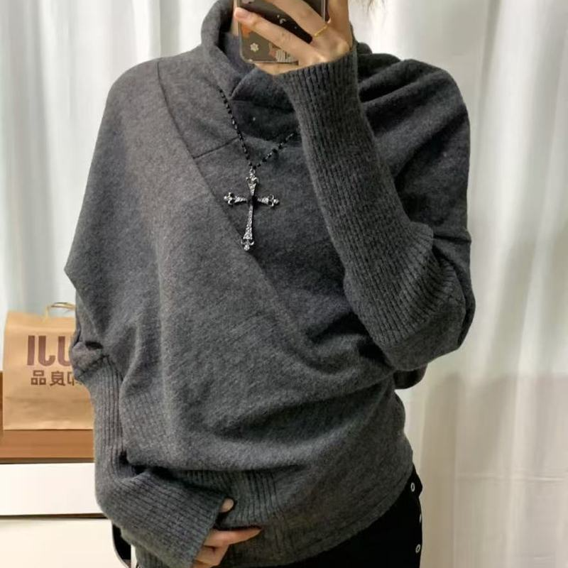 美式复古蝙蝠袖高领灰色毛衣女2025秋季新款套头针织衫设计感上衣