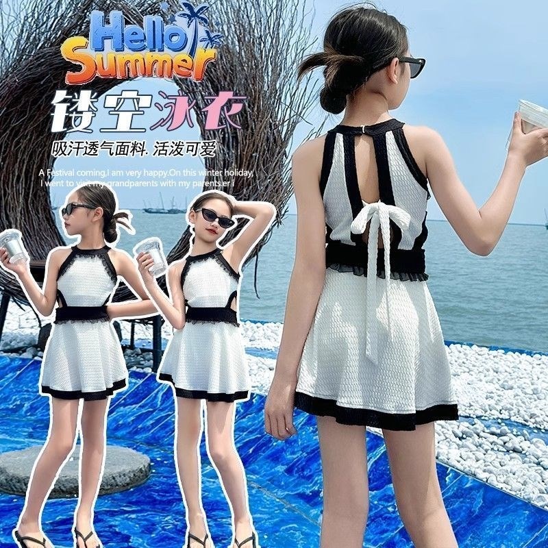 女生泳衣女大童初中生带胸垫儿童连体款女童白色游泳衣裙子少女孩