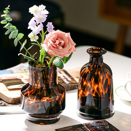 高级感网红豹纹花瓶轻奢玻璃插花家居样板间花器客厅小众装饰摆件