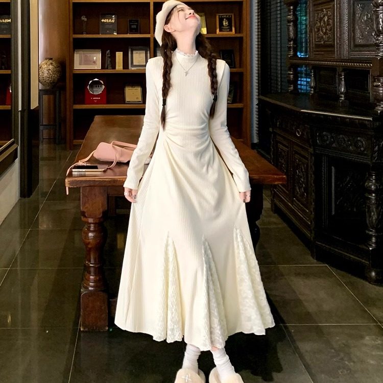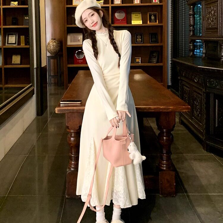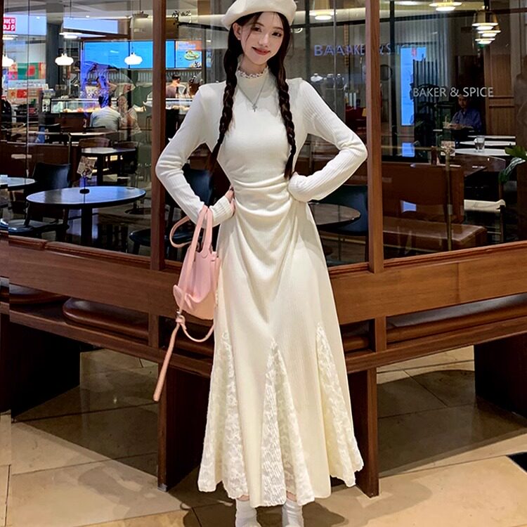 长袖打底针织连衣裙子女秋冬蕾丝拼接鱼尾裙收腰配大衣内搭毛衣裙