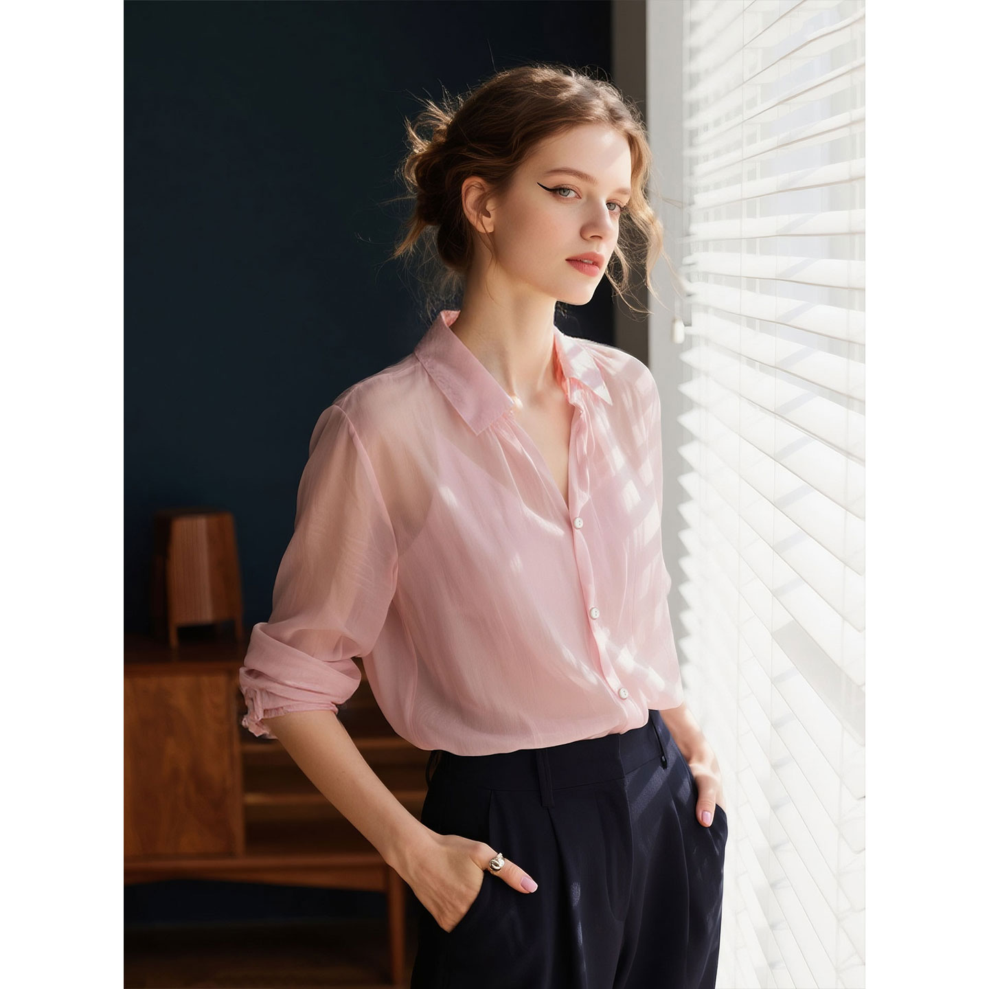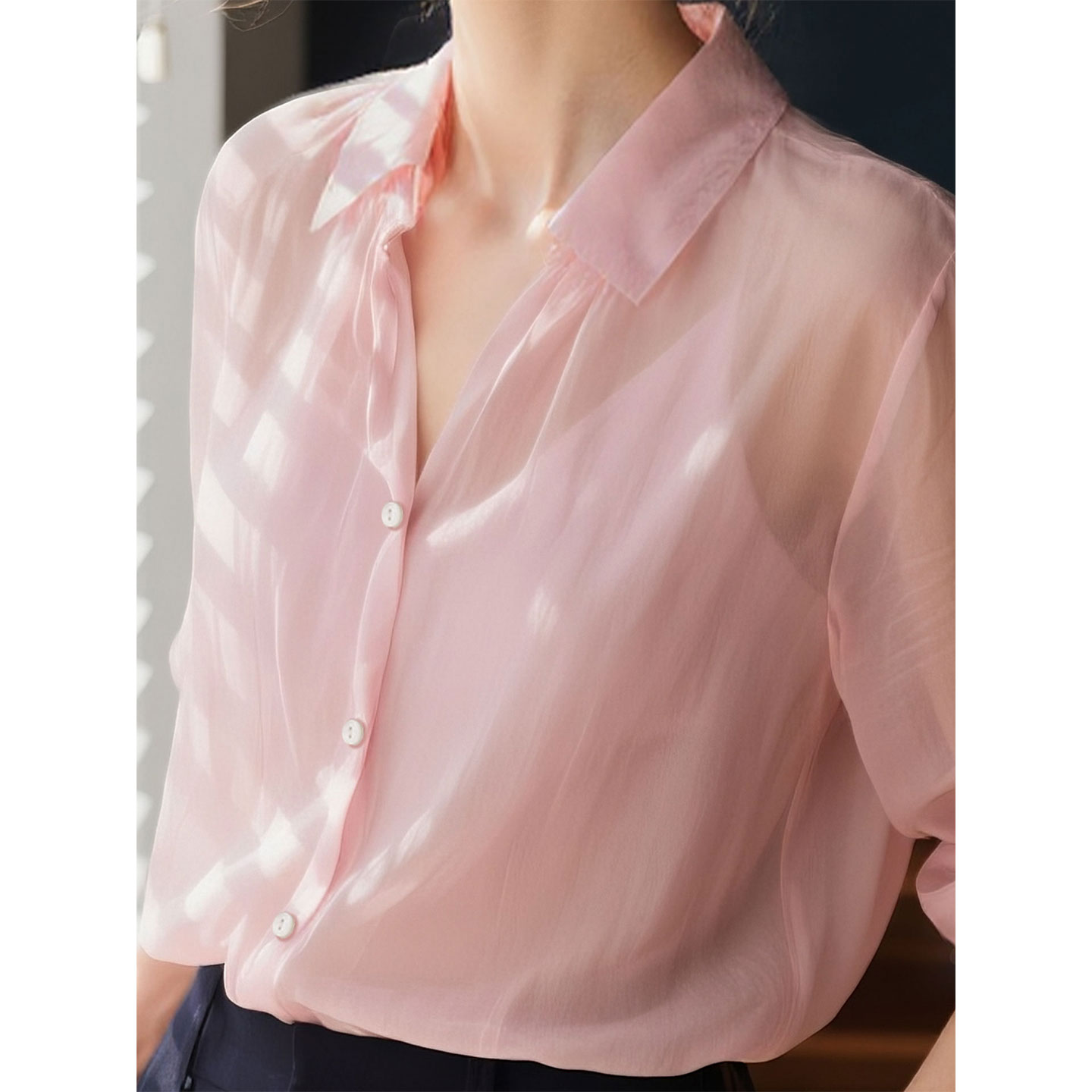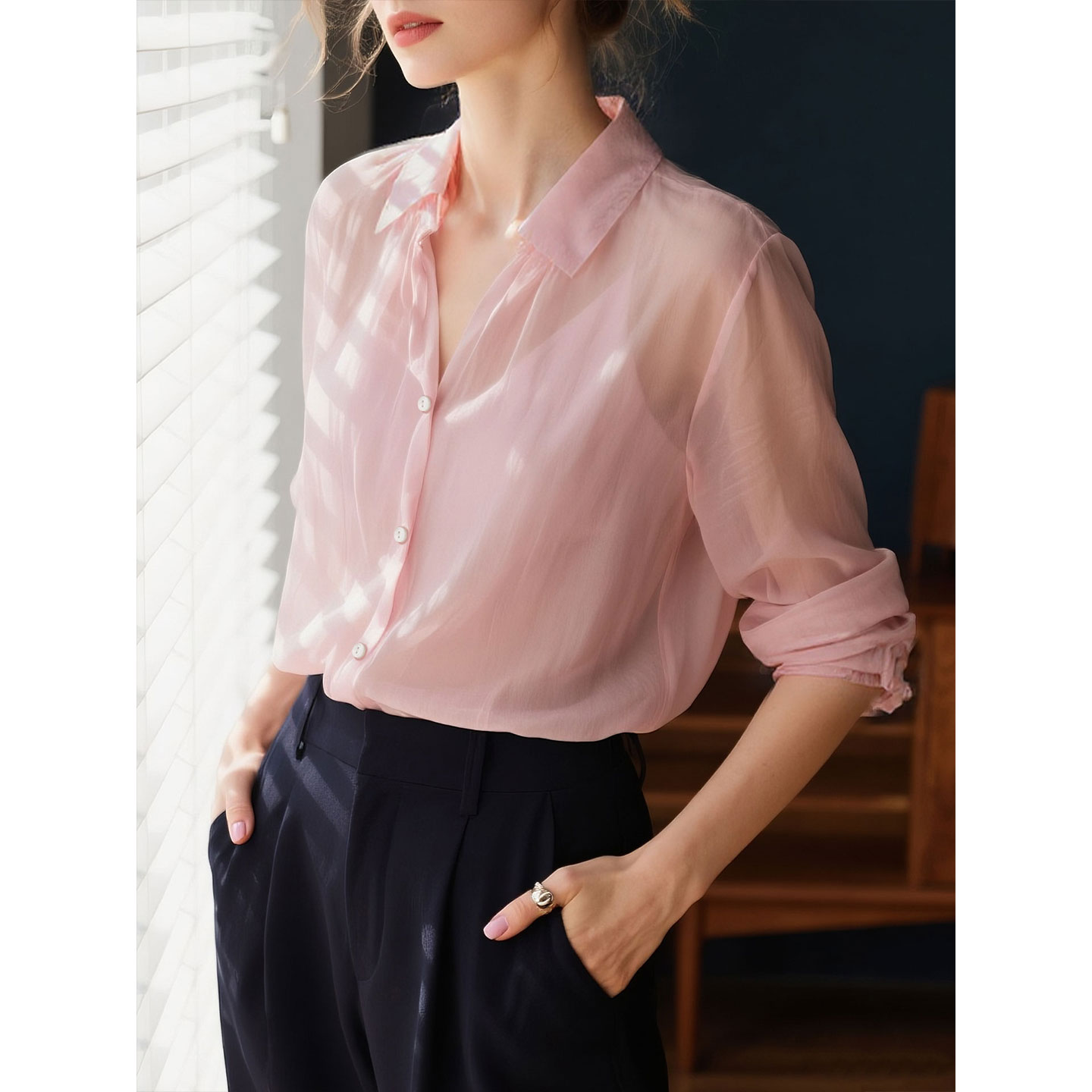 粉色V领雪纺长袖衬衫女2025年秋季新款优雅显瘦衬衣早春穿搭上衣