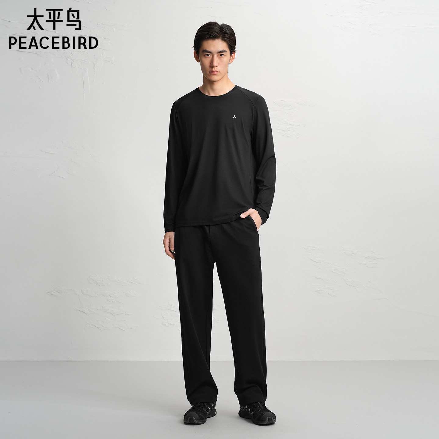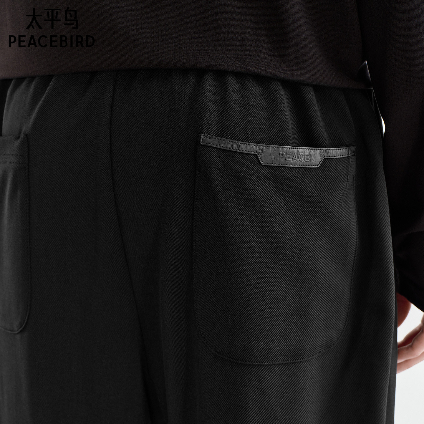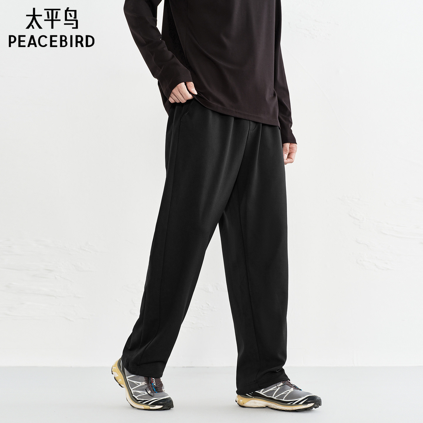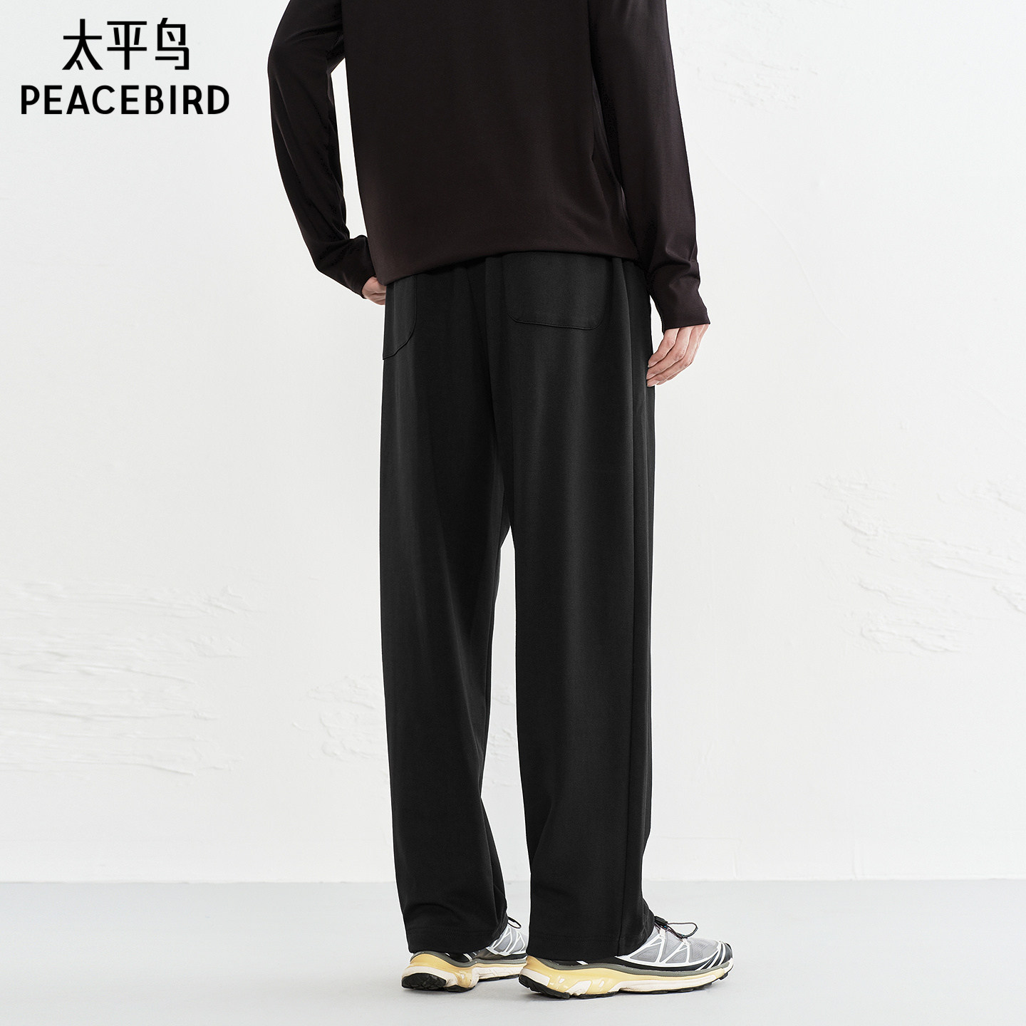 太平鸟男装 冬季黑色直筒缝标休闲裤宽松撞色抽绳运动百搭长裤