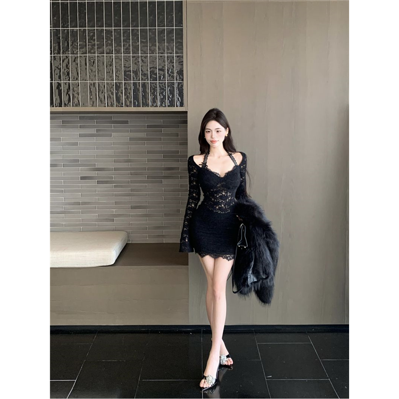 蕾丝拼接挂脖v领连衣裙女秋冬长袖修身包臀裙黑色收腰纯欲短裙子