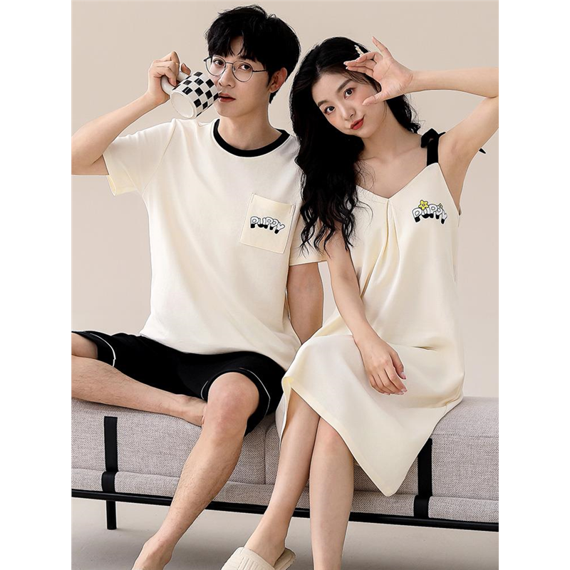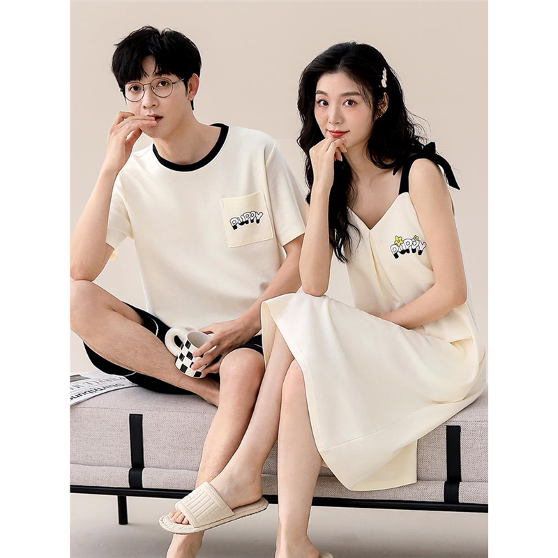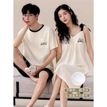 带胸垫吊带睡裙女防凸点夏季纯棉情侣睡衣短袖薄款男士家居服套装
