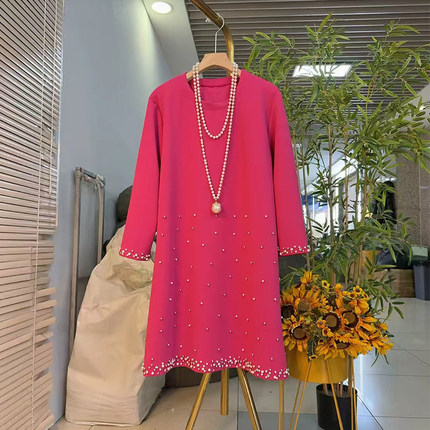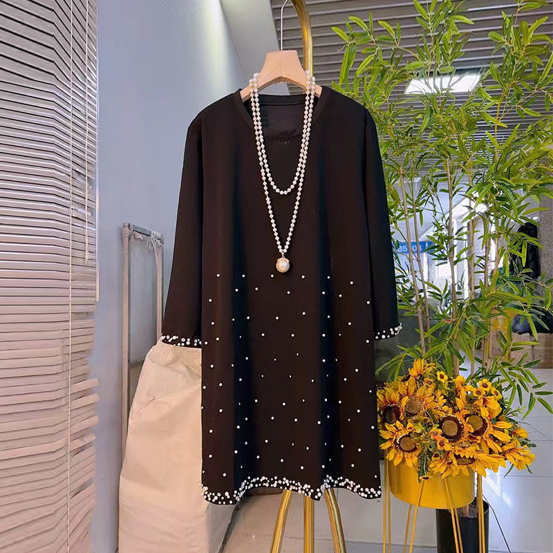 大码圆领钉珠边长袖T恤裙