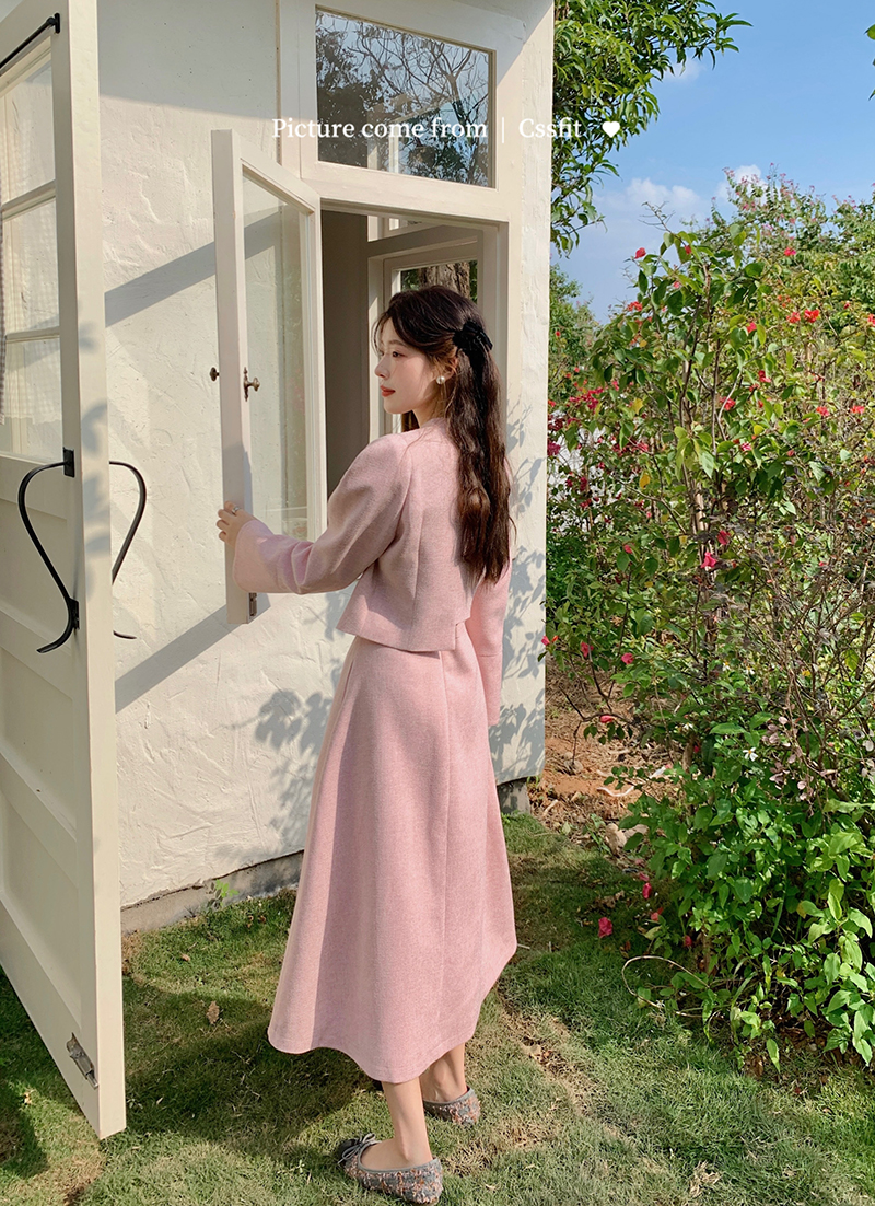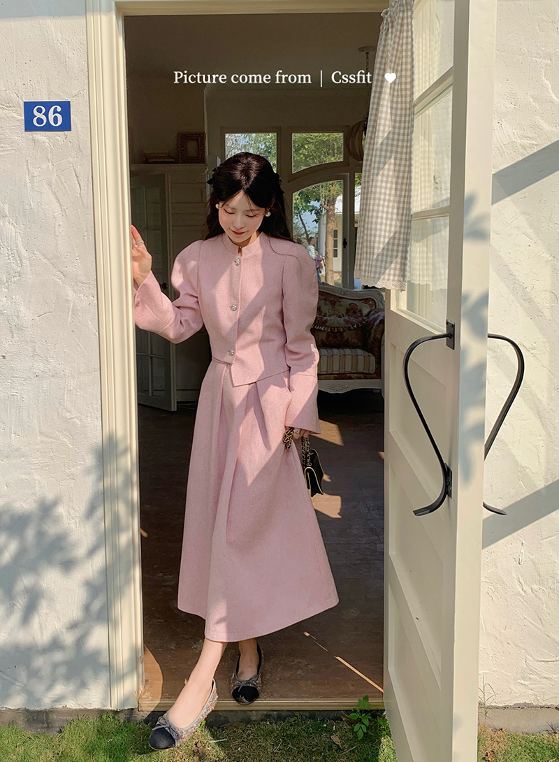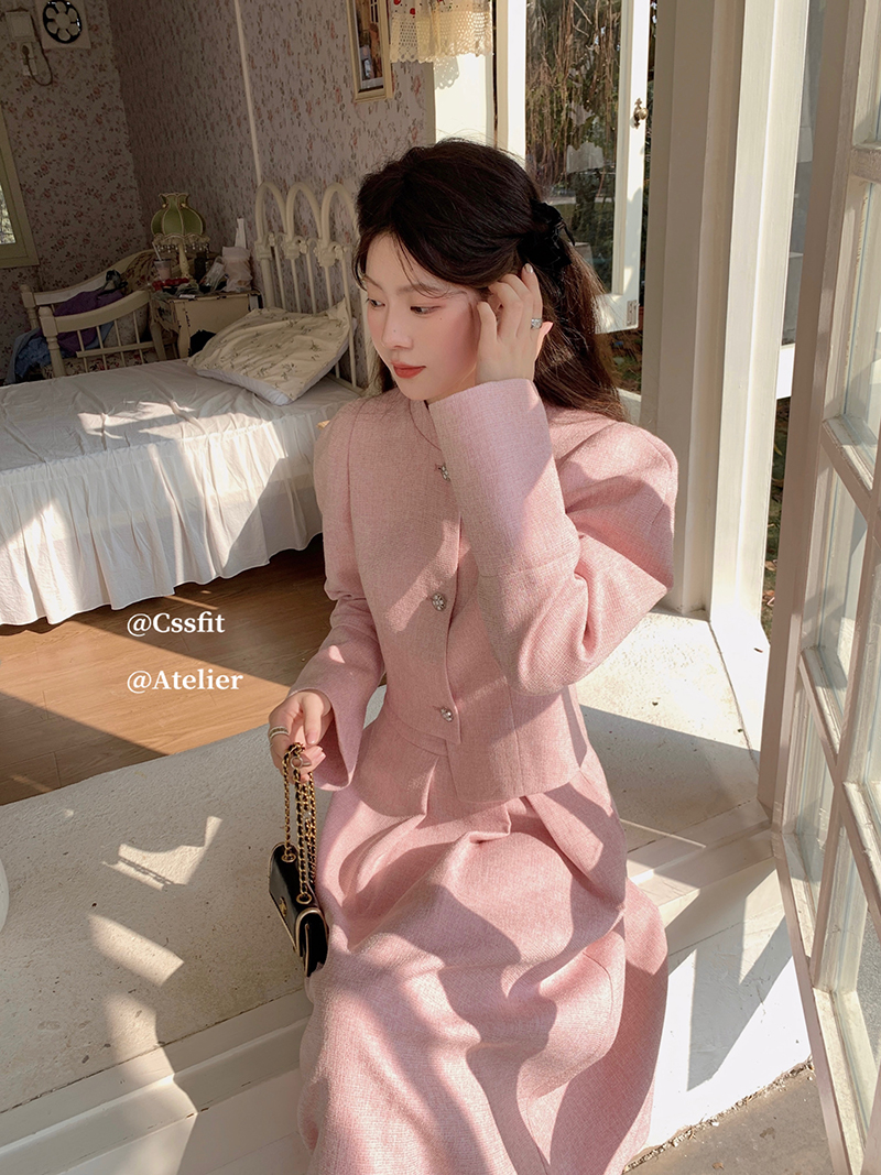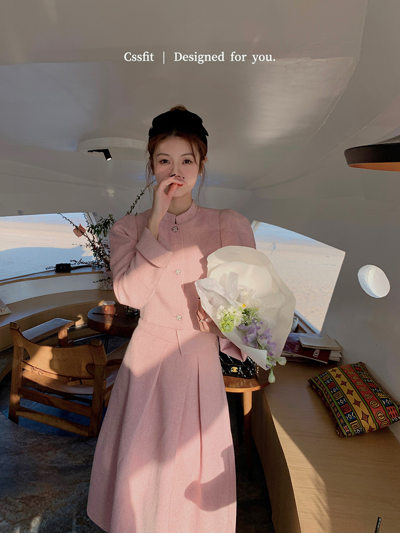 迟伞伞 Seoul大小姐立领法式套装女气质不规则设计樱花粉外套长裙
